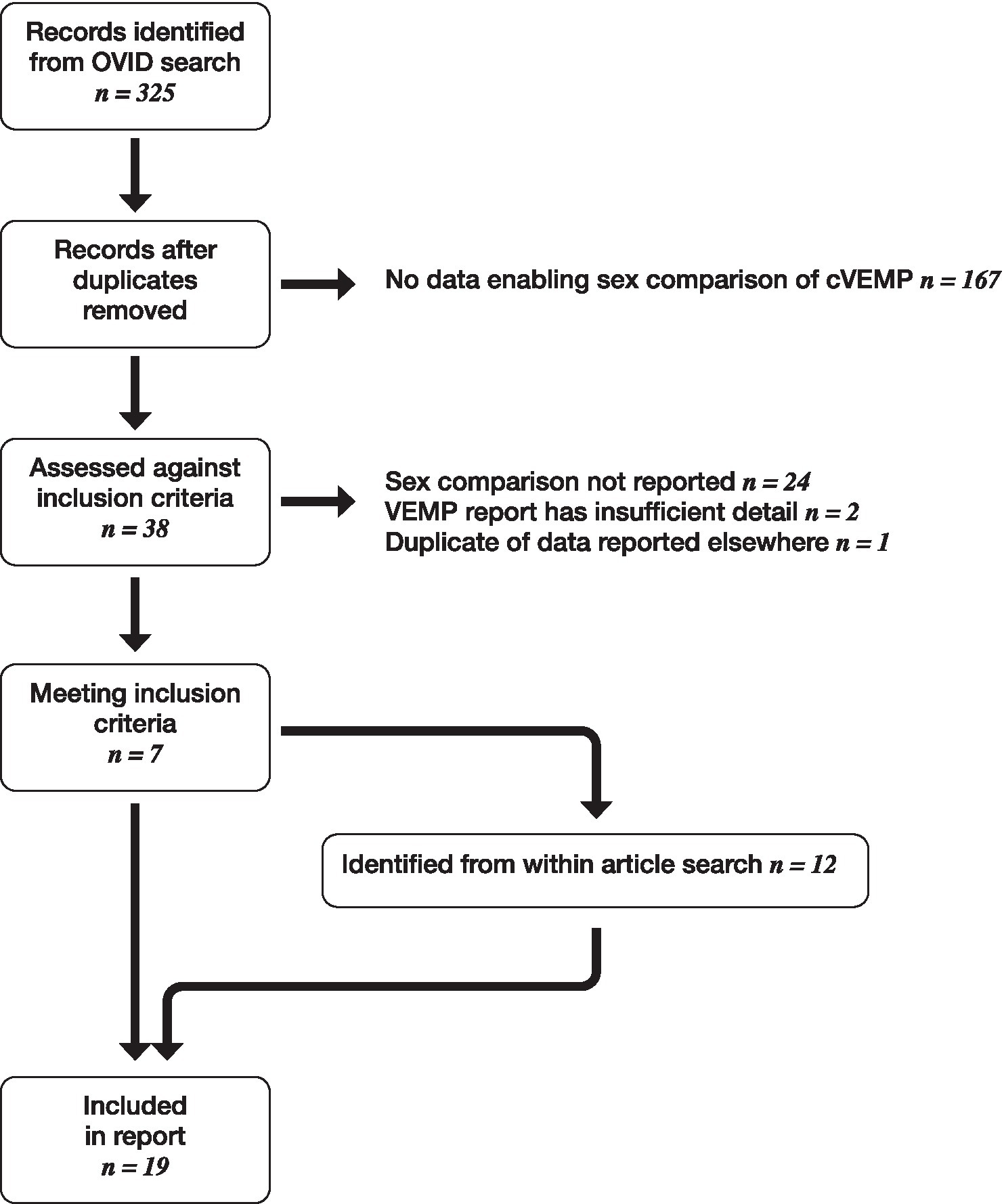 Articles were restricted to those in English language only. There were no restrictions for grey literature (e.g., Ph.D. dissertations, pre-prints, conference proceedings). Abstracts were reviewed by hand. Inclusion criteria were that studies had to include VEMP assessment of patients without co-morbidities, and had to report a comparison of p1 and n1 amplitude and latency between women and men. Review focused on data which would enable an appraisal of statistical power relative to the current study. Criteria for comparison between studies included number of partipants, age and sex matching, type and quantity of stimuli used and results of the sex comparison.
