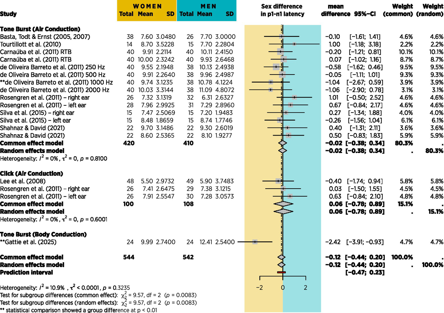 | Brantberg and Fransson (2001) | 11F, 12 M, aged 22–42 years. No age breakdown provided according to sex. | AC 100 dB nHL clicks. | 128 clicks per sequence, 768 total presentations. Six conditions (monaural right/left and four binaural presentations at different rates). Two sequences per condition. | Amplitude: No significant sex differences. Latency: p1 was shorter in women than men by 0.74 ms (p < 0.001) for binaural clicks, and 0.89 ms (p < 0.05) for monaural clicks. |