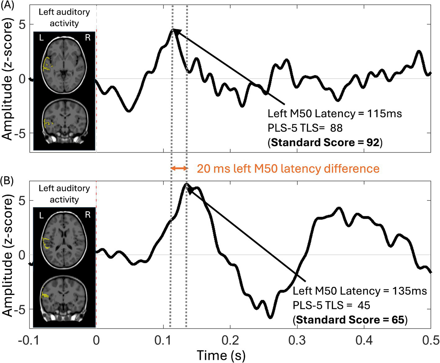 In each child, left-and right-hemisphere auditory source timecourses were obtained from left-and right-hemisphere auditory ROIs (Chen et al., 2023). The M50 response was first identified via the sensor magnetic field sink and the source topography (e.g., in the left hemisphere, an anterior source and posterior sink) and with left and right M50 ROIs created at the time of the peak M50 sensor activity using an amplitude threshold of 5 nAm and a cluster threshold of ≥50 neighboring cortical surface vertices. A left and right auditory source timecourse was obtained via averaging across vertices within the left and right ROI, with post-stimulus activity normalized to the baseline (i.e., providing post-stimulus Z-score measures; see Figure 1, auditory source timecourses from two representative participants). Using in-house MATLAB software, left and right peak M50 latencies, within ±30 ms surrounding the peak time point identified at the sensors, were identified in source space.