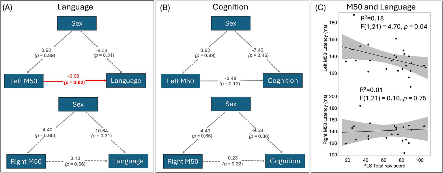 (A) SEMs of M50 latency, sex, and language. The estimates of the regressions between the factors are shown. Directed paths are shown as arrows between the factors, with a significant association highlighted in red; (B) SEMs of M50 latency, sex, and cognition show no significant associations; (C) The scatterplot between left and right M50 latency and PLS-5 score identifies a significant association between left hemisphere M50 latency and language ability, with a later M50 latency associated with a lower language ability score.