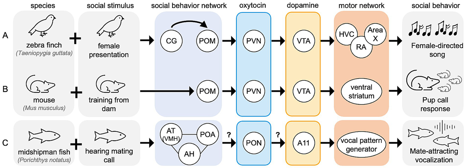 In mice, experienced mothers respond quickly to distress calls made by mouse pups outside of the nest, while naïve females may ignore the pups completely. Therefore, the motor response to mouse pup calls is a learned, or experience-driven behavior. Naïve females can learn these pup care behaviors from experienced to naïve females, in a social process mediated by oxytocin-expressing PVN neurons (Carcea et al., 2021). In adult female mice, activation of oxytocin receptor-expressing neurons in POM is positively correlated with pup exposure, and oxytocin expression is higher the PVN and SON of high pup exposure groups compared to low pup exposure groups (Okabe et al., 2017). Additionally, oxytocin-expressing PVN neurons are more active during mouse pup care behaviors than during infanticide, and optogenetic activation of these neurons reduced infanticide behaviors (Li et al., 2024), linking oxytocin signaling to the learning of mouse pup care behavior. Activation of VTA dopamine neurons is also positively correlated with mouse pup retrieval; inhibiting these neurons increases retrieval delay compared to response times in uninhibited mice (Xie et al., 2023). Similarly, endogenous dopamine release in the ventral striatum, a region influenced by VTA activity increases in maternal rats (Hansen et al., 1993). Given that POM synthesizes oxytocin, it is unclear whether the activation of oxytocin receptor neurons in POM is self-generated or mediated by another nucleus. However, PVN innervates VTA in rodents, suggesting this oxytocinergic signaling in PVN may directly trigger dopamine release in the ventral striatum via VTA, facilitating context-sensitive motor behavior. Furthermore, oxytocin-mediated dopamine signaling in vertebrate species may play a conserved role in social behaviors, as recently reviewed (Rappeneau and Díaz, 2024). Of course, while the adult female mice do not learn vocal responses to pup calls, they exhibit a learned motor behavior that is socially driven. In this way, this response is the mouse is context-sensitive and may be under control of a neural mechanism similar to that in the songbird (Figure 5B).