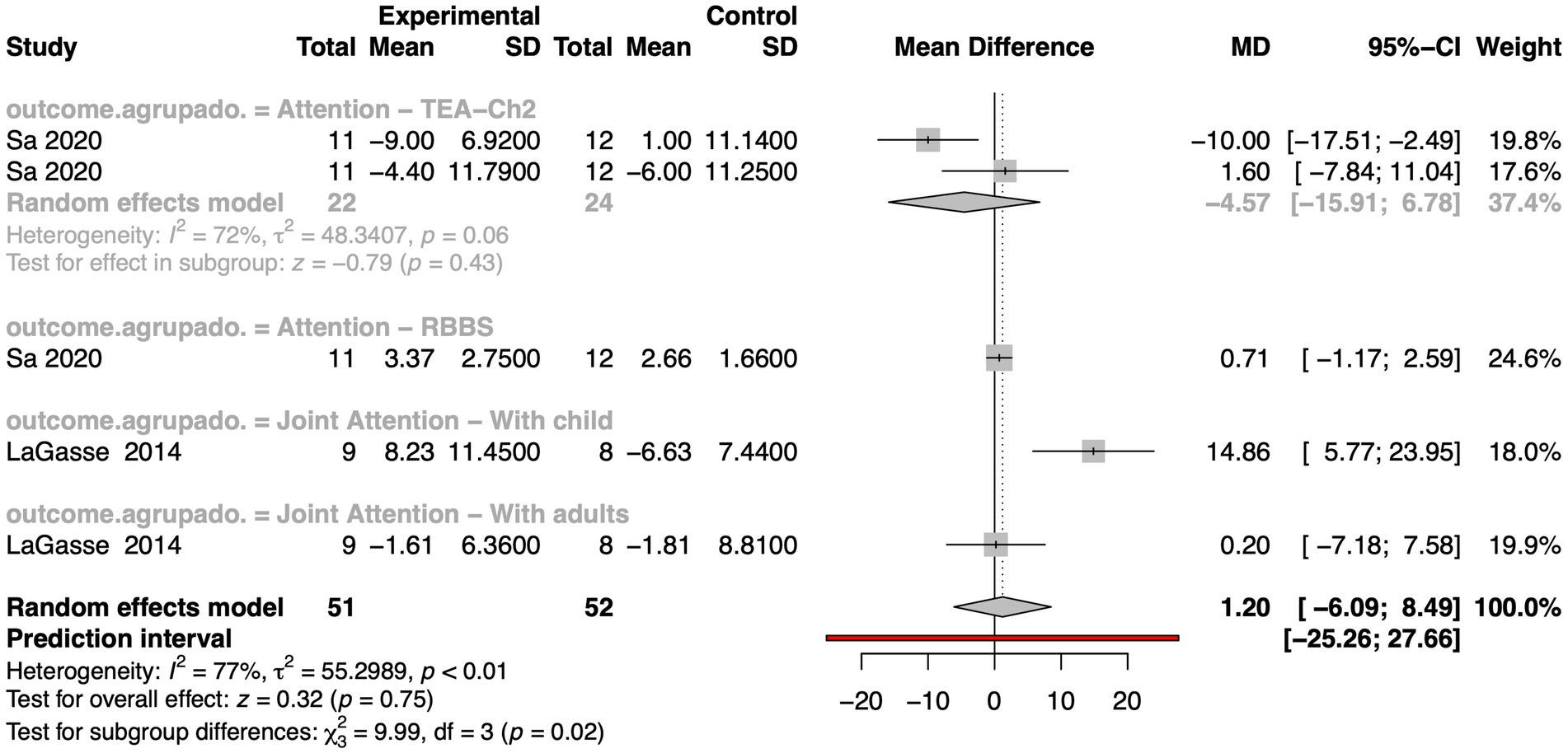 Figure 2. Forest plot illustrating the effect sizes (mean differences) for studies comparing interventions and controls about attention outcomes in autistic individuals. The plot includes each study’s mean difference (MD), 95% confidence interval (95% CI), and statistical weight. Summary estimates were calculated using a random effects model. Heterogeneity statistics (I2, τ2, and p-values), prediction intervals, and tests for subgroup and overall effects are also provided.