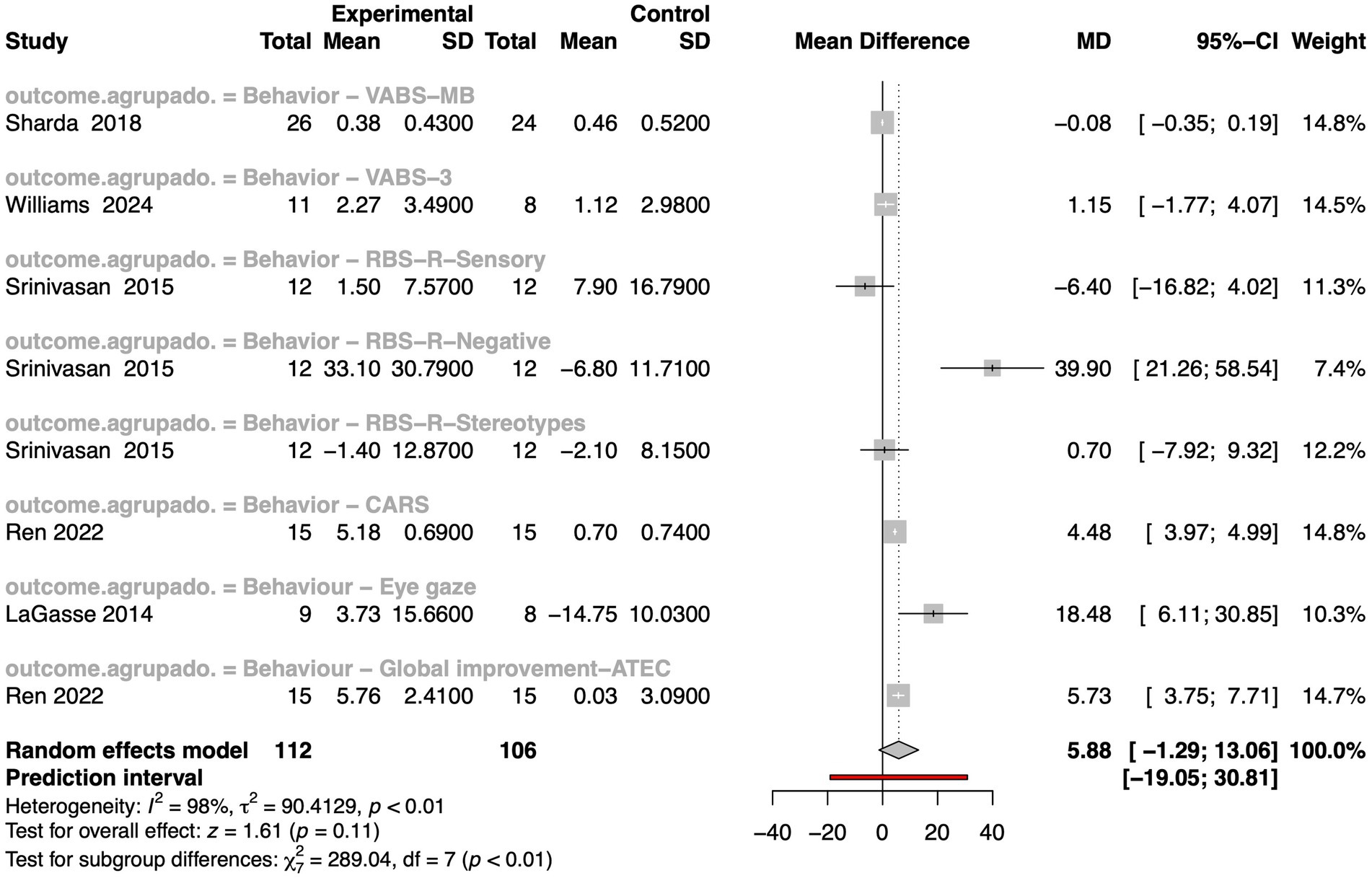 Figure 3. Forest plot depicting comparative mean differences for behavioral outcomes between intervention and control groups in autistic individuals. The plot presents mean differences, 95% confidence intervals, and weights for each study. Summary estimates were calculated using a random effects model, along with heterogeneity measures (I2, τ2, and p-values), prediction intervals, and subgroup/overall test results.