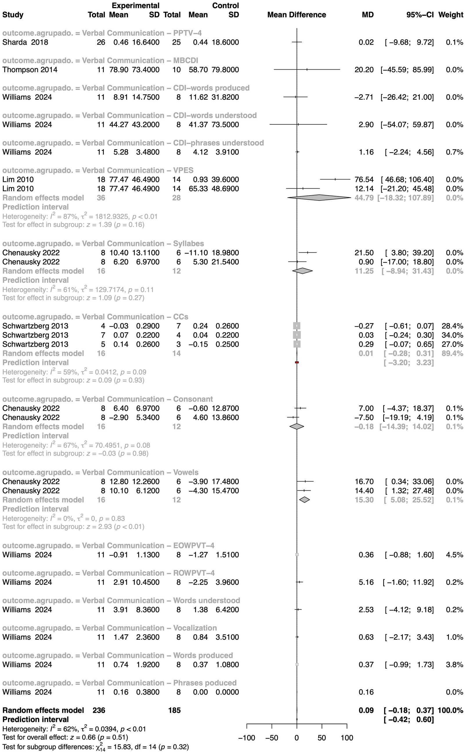 Figure 4. Forest plot summarizing intervention effects on verbal communication in autistic individuals. Individual study data include mean differences, 95% confidence intervals, and weights, with pooled estimates computed using a random effects model. Heterogeneity measures, prediction intervals, and subgroup analyses are also presented.
