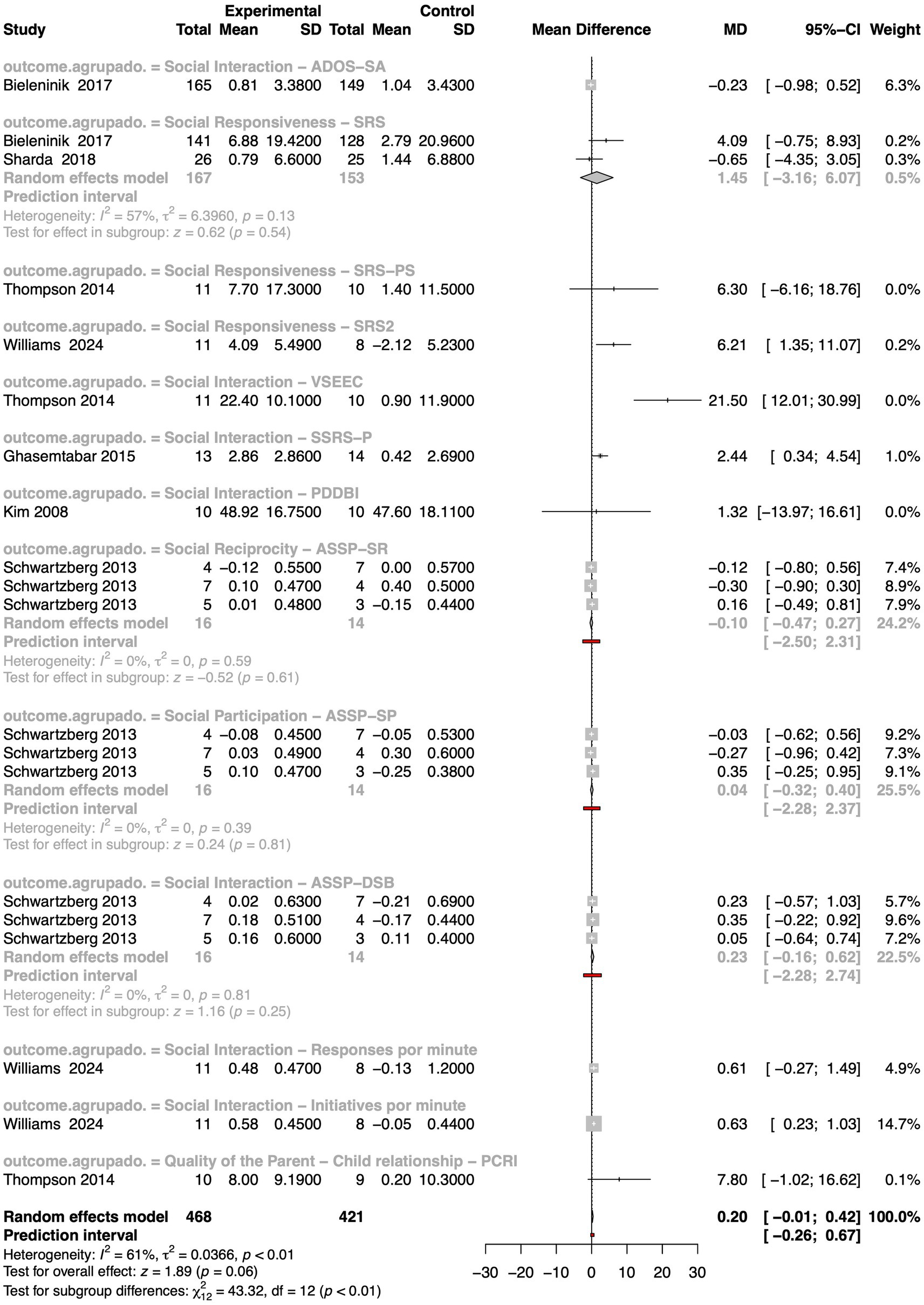 Figure 7. Forest plot presenting the effects of interventions on social interaction in autistic individuals. The figure shows mean differences between experimental and control groups, confidence intervals, and study weights. Summary estimates were generated using a random effects model, and the figure includes heterogeneity measures, prediction intervals, and subgroup/overall effect tests.