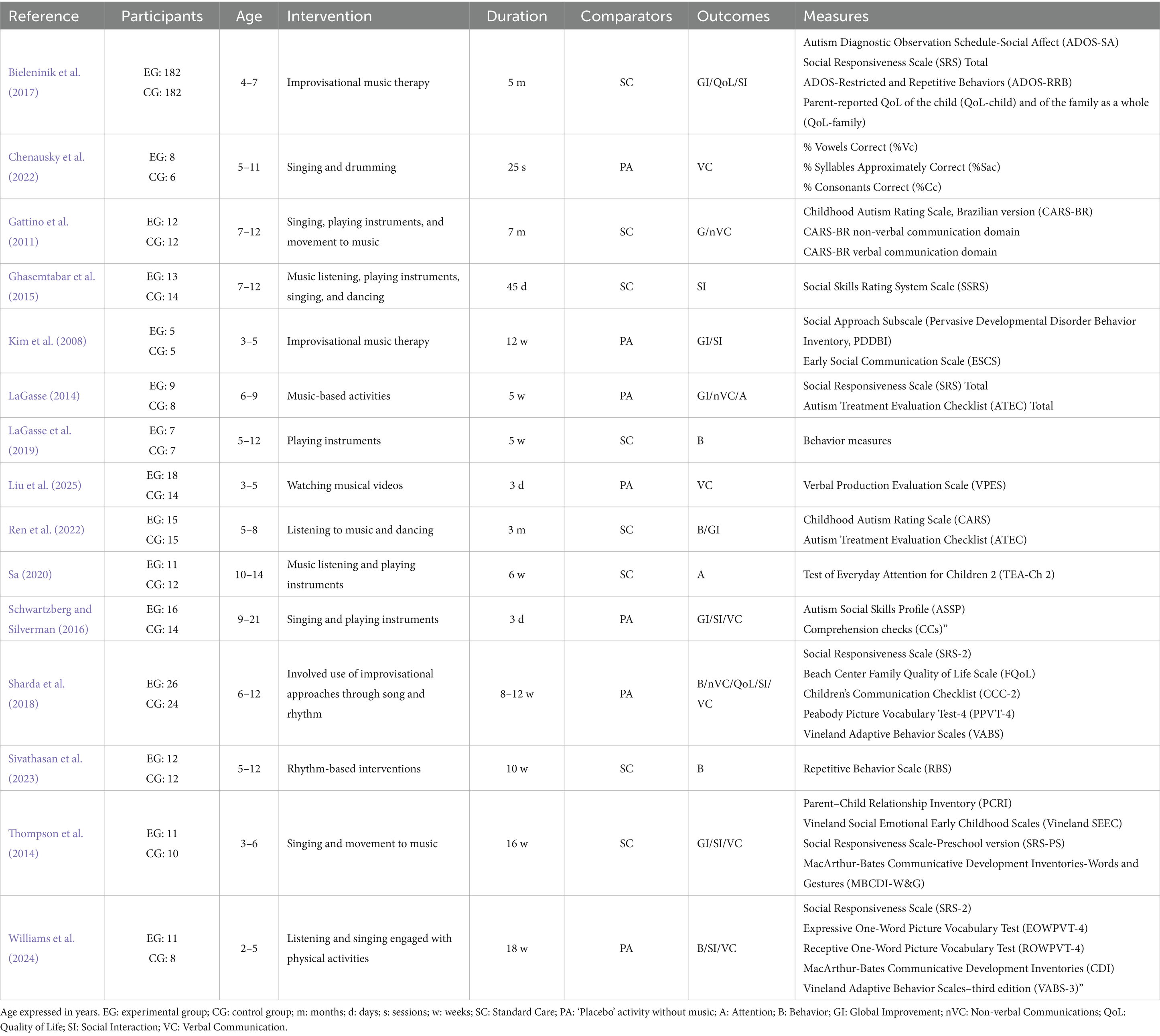 Gao, X., Xu, G., Fu, N., Ben, Q., Wang, L., and Bu, X. (2024). The effectiveness of music therapy in improving behavioral symptoms among children with autism spectrum disorders: a systematic review and meta-analysis. Front. Psych. 15:1511920.