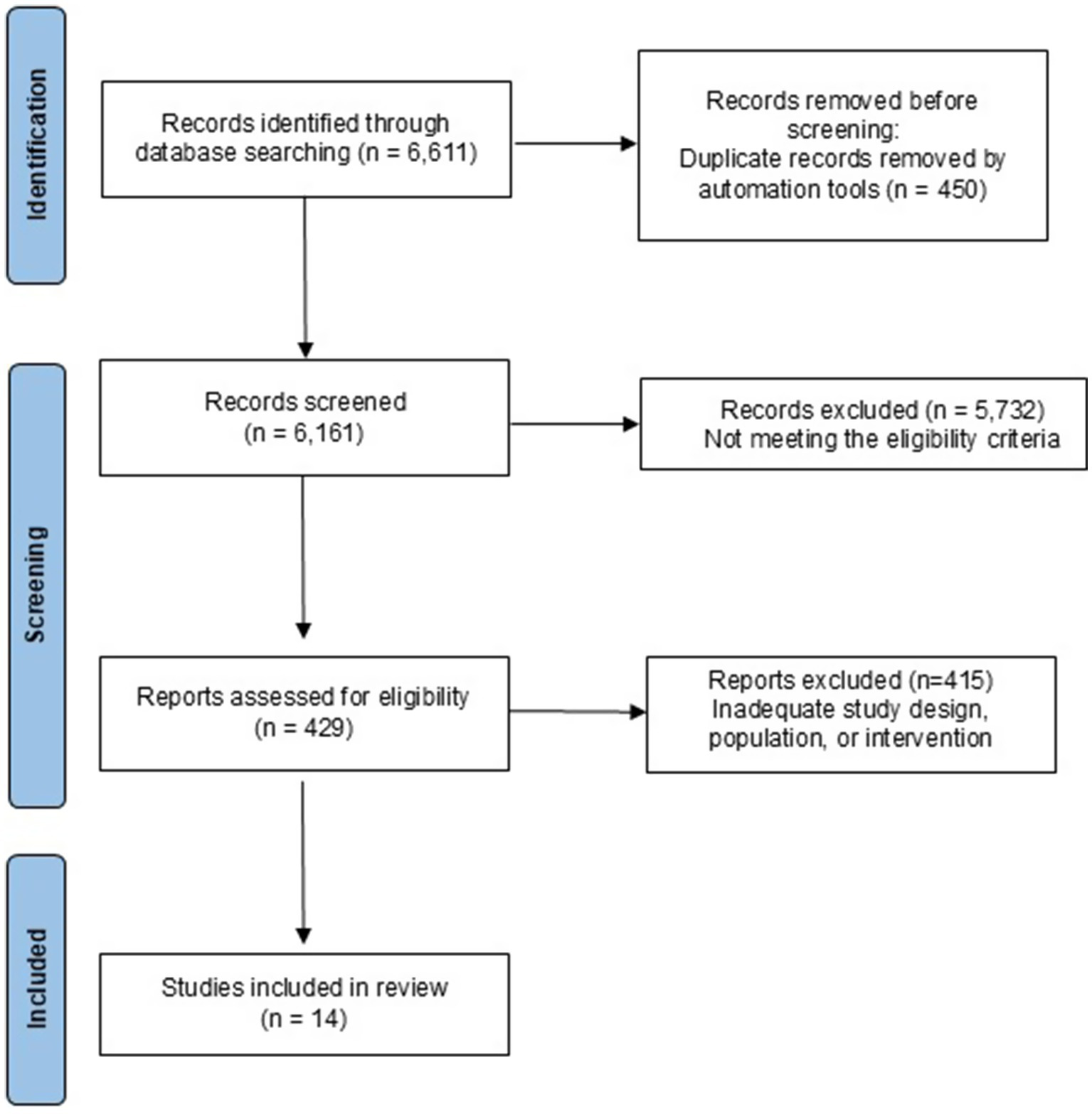 A systematic search in PubMed, Web of Science, ScienceDirect, and Scopus databases yielded 6,611 studies. After removing 450 duplicates, 6,161 articles were screened as potentially eligible for inclusion. Following title and abstract screening, 5,732 records were excluded for not meeting the eligibility criteria. A total of 429 full-text articles were assessed for eligibility, of which 415 were excluded for reasons such as inadequate study design, population, or intervention. Ultimately, 14 studies met all inclusion criteria and were included in the systematic review. The PRISMA flow diagram summarizing this selection process is presented in Figure 2 (see Table 1).