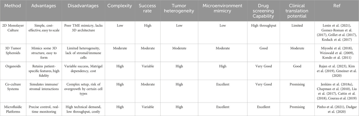 Despite their promise, organoids have limitations. Most organoids lack a complete tumor microenvironment (e.g., functional blood vessels, immune cells, and nerves), making it challenging to fully assess immune checkpoint responses and angiogenesis. In addition, organoid formation efficiencies vary between tumor types; for example, non-small cell lung cancer is difficult to construct due to the overgrowth of normal airway cells into lung cancer organoids (Dijkstra et al., 2020). Furthermore, their culture requires expertise and infrastructure (Gjorevski et al., 2016), and during culture, fast-growing clones may dominate, potentially reducing heterogeneity.