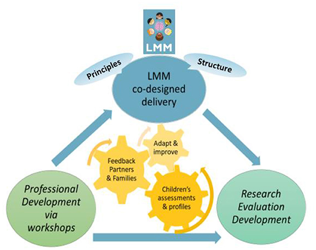 LMM is a research-based program designed drawing on established research in bilingual development, early childhood education, and language immersion, as reviewed in previous literature (Espinosa, 2015). Our design is also collaborative as it unites community stakeholders with new generations of language learning facilitators to support lifelong multilingualism in Australia and globally (See Figure 1). Many LMM facilitators3 were educators in their home countries before immigrating to Australia, bringing strong skills in engaging children in the target language4. Some have advanced their careers by pursuing postgraduate research within the LMM program, demonstrating the professional development benefits of our training. Figure 1 depicts the multifaceted nature of the LMM program and its collaborative design with educators, families and the educational settings at which the program is delivered.