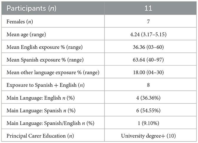 Eleven HL children attending the bilingual preschool participated in IMP-1. Table 1 shows children's demographic information collected with a background questionnaire that parents filled out at the same time they signed a consent form for their child's participation. Data collection was approved by Western Sydney Human Research Ethics Committee. All children were acquiring two or three languages simultaneously: HL Spanish plus English as the societal language, with the three other reported languages being Estonian, Dutch and Russian. At home, they were exposed to HL Spanish 40% to 97% of their weekly awake time at home and at the bilingual preschool. Most mothers had a university or higher degree (n = 10), indicating high socio-economic status (SES).