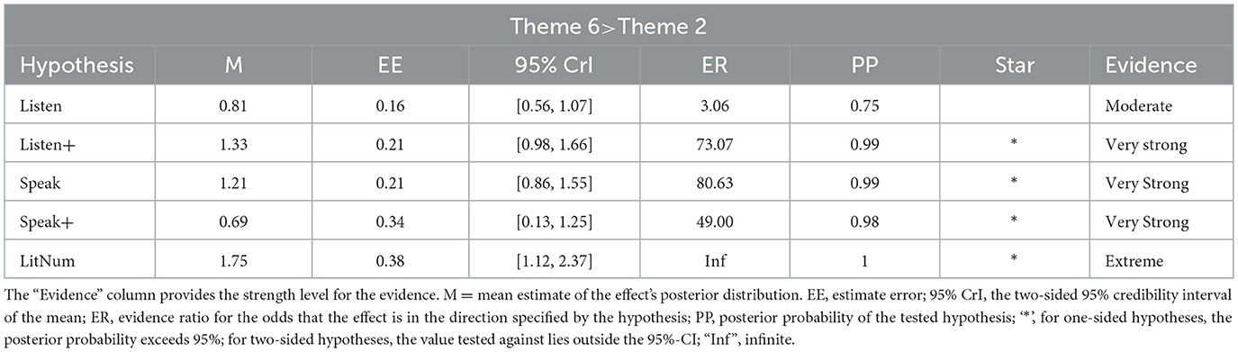 6. ^Mean estimate (M) reflects the average size of the difference observed between Theme 6 and Theme 2. The estimate error (EE) gives an idea on how precise this estimate is. The 95% credibility interval (95% CrI) shows the range within which the true value is likely to fall based on the data. The evidence ratio (ER) indicates how much more likely the observed effect is than the alternative (e.g., no difference), and the posterior probability (PP) reflects the degree of certainty in the result (values closer to 1 indicate stronger support). To assist with the interpretation, statistically meaningful results are marked with “*” and an evidence label, i.e., moderate, strong, very strong, or extreme, indicates the level of confidence with which each finding is supported.