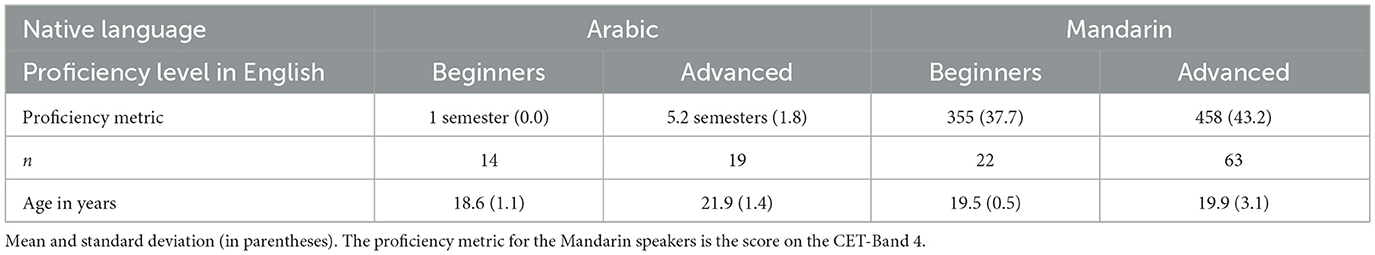 Learners of English were recruited from Qassim University in the Kingdom of Saudi Arabia (who were native speakers of Najdi Arabic) and from Kunming University of Science and Technology in the People's Republic of China (who were native speakers of Mandarin). Summary information about the participants is in Table 1. Data on gender/sex was not collected.