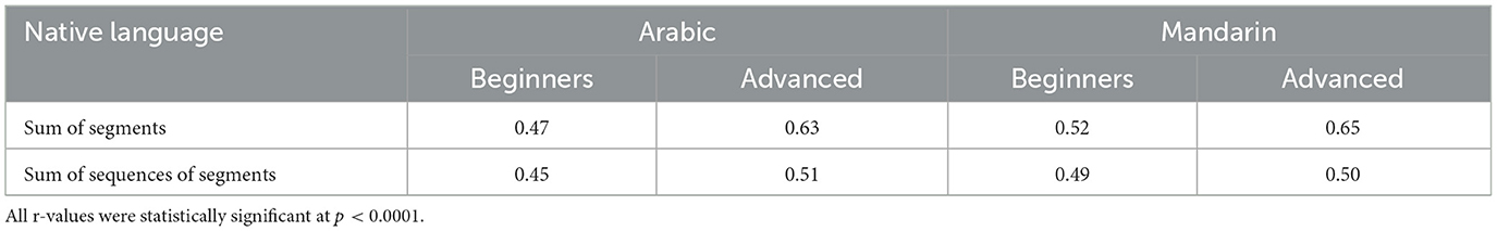 Analysis using Fisher r-to-z transformation to test for a significant difference between two correlation coefficients shows that the correlation between the subjective ratings of the Arabic Beginner and Advanced learners (r = 0.78) was significantly greater than the correlation between the subjective ratings of Beginners and native speakers [r = 0.55; z(60) = 2.28, p < 0.05]. Similarly, the correlation between the subjective ratings of Beginner and Advanced learners (r = 0.78) was significantly greater than the correlation between the subjective ratings of Advanced learners and native speakers [r = 0.51; z(60) = 2.58, p < 0.01]. No other comparison was significant different.