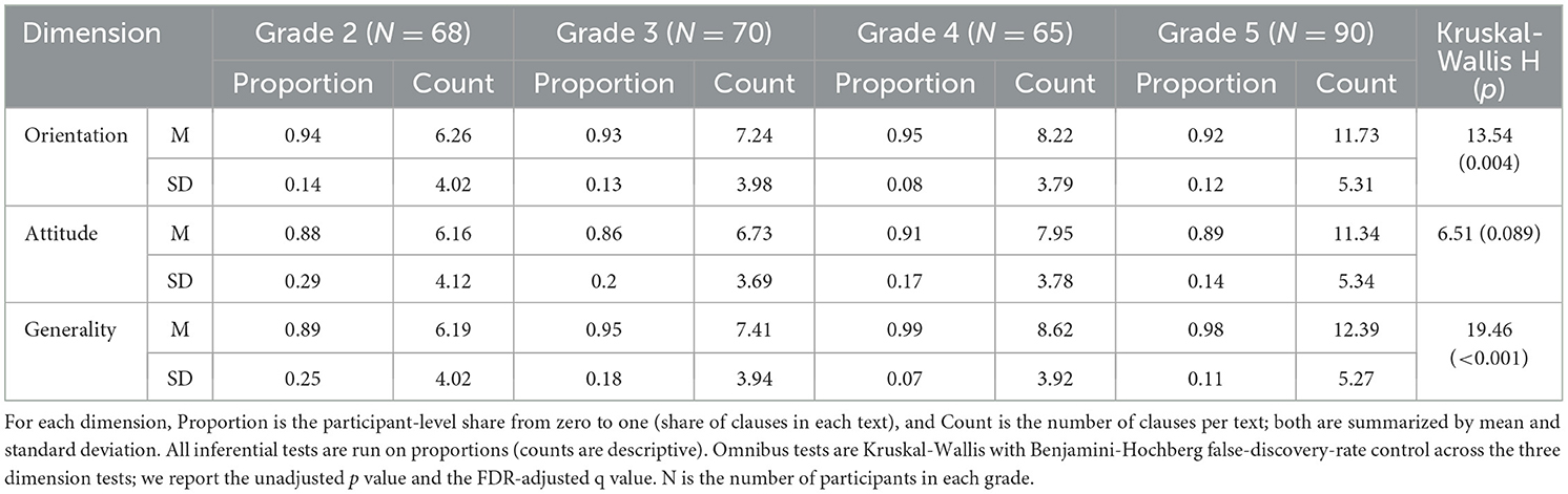 For clarity, Table 1 is descriptive and is presented at the grade level. All inferential tests reported in Sections 3.1–3.3 are conducted at the text (participant) level. As expected, per-text clause counts tended to increase from Grade 2 to Grade 5, indicating longer texts in later grades. Crucially, the DS density appeared to remain around 2.8 markings per clause across grades (2.82, 2.81, 2.86, 2.78). Thus, developmental gains reflect greater productivity (more clauses per text) rather than a change in how densely stance is encoded within clauses. The following sections address the research questions in turn: research question 1 examines grade-level differences in the three DS dimensions (Orientation, Attitude, Generality); research question 2 turns to the nine DS categories; and research question 3 analyzes within-grade associations among these categories.