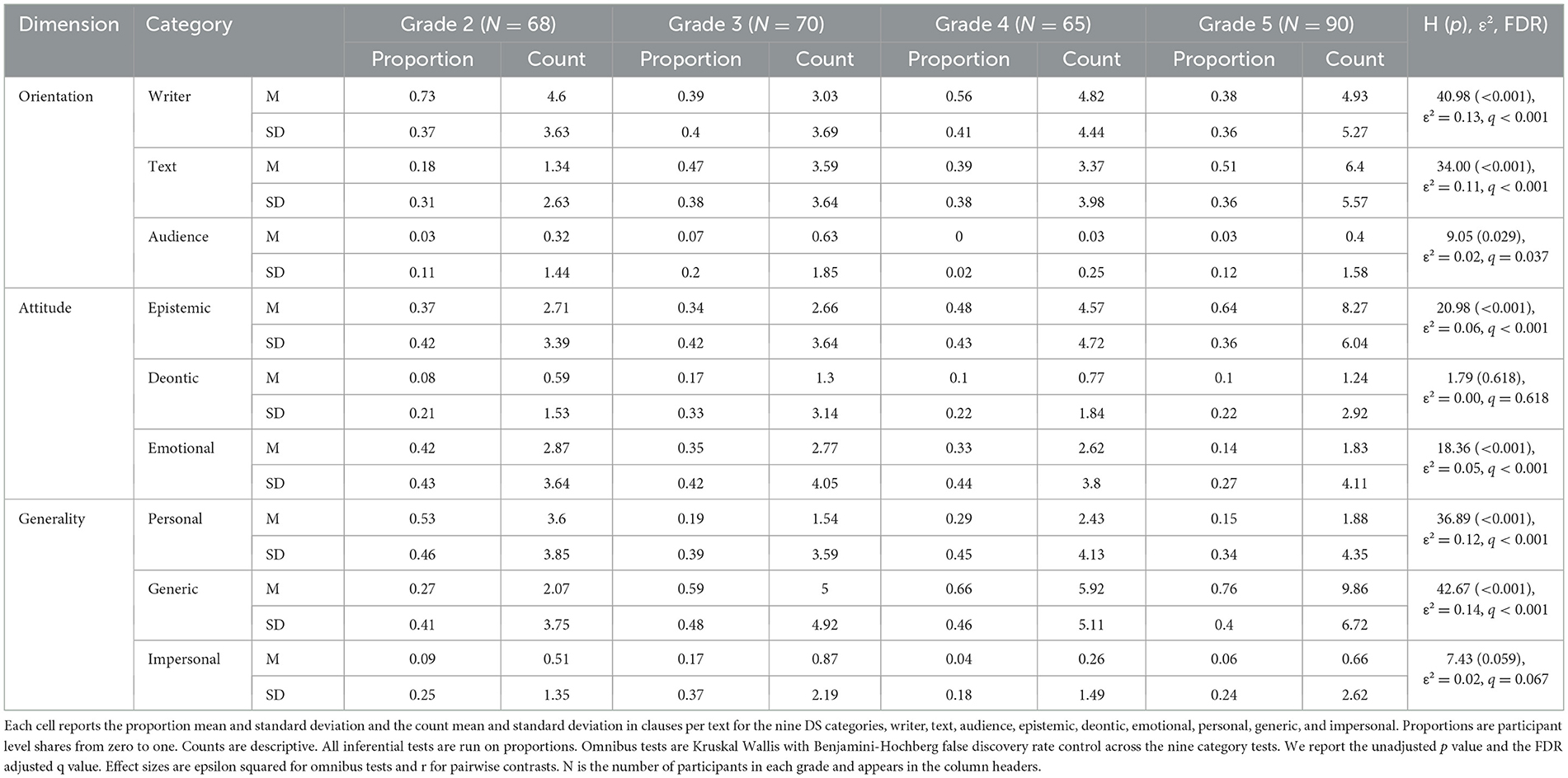 To address research question 2, we analyzed how each of the nine discourse stance (DS) categories was used across Grades 2 to 5. Research question 2 corresponds to Hypothesis 2, which anticipated distinct developmental trajectories for individual stance categories (for instance, increases in text orientation, epistemic stance, and generic generality, and decreases in personal and emotional stance). Specifically, we examined the categories nested within the three dimensions: orientation (writer, text, audience), attitude (epistemic, deontic, emotional), and generality (personal, generic, impersonal). Table 3 presents participant-level proportions and count-based productivity in clauses per text, both summarized by mean and standard deviation, alongside Kruskal Wallis omnibus tests, effect sizes, and FDR-adjusted p values for each category. While Table 3 reports participant-level results, Supplementary Table 3S complements this information by providing clause-level counts and percentage shares for each stance category within grade. Counts mix two processes. They reflect how much a student writes and which stance category the student chooses. Proportions hold text length constant by using clauses as the denominator, so they tell us how writers allocate stance within their texts. In our data, mean counts are often smaller than their standard deviations, which signals high dispersion driven by large differences in text length and many zero values. This makes counts noisy and can blur the profile of stance written expression. Proportions provide a stable, comparable scale across grades, they isolate choice rather than productivity, and they are the basis for our inference. Counts remain in the tables to give context about productivity, but the developmental story is best read from the proportion values.