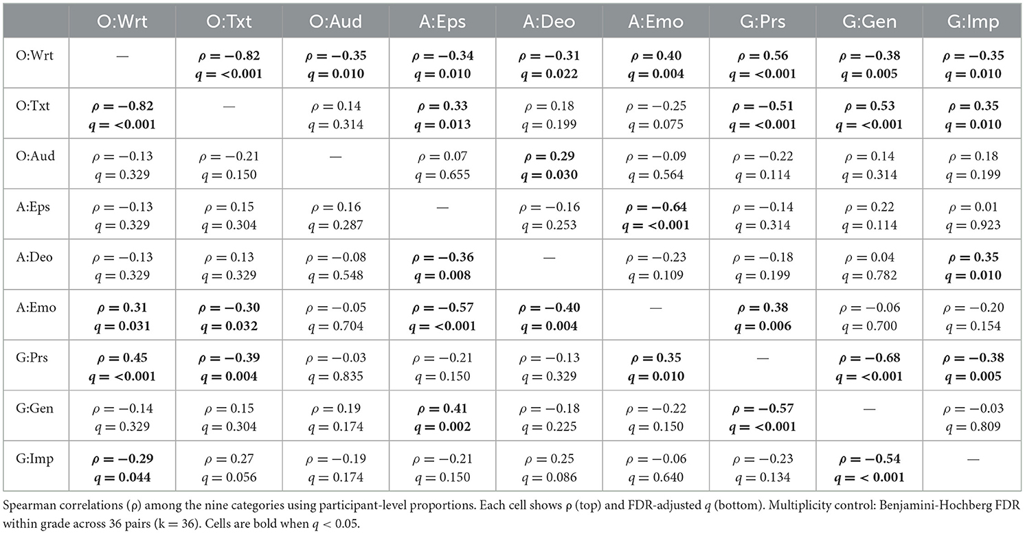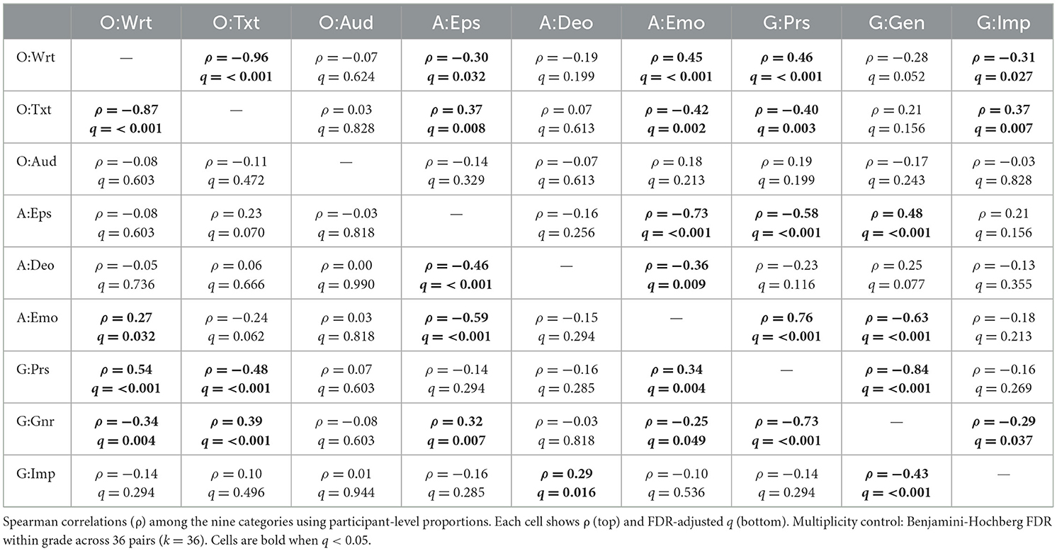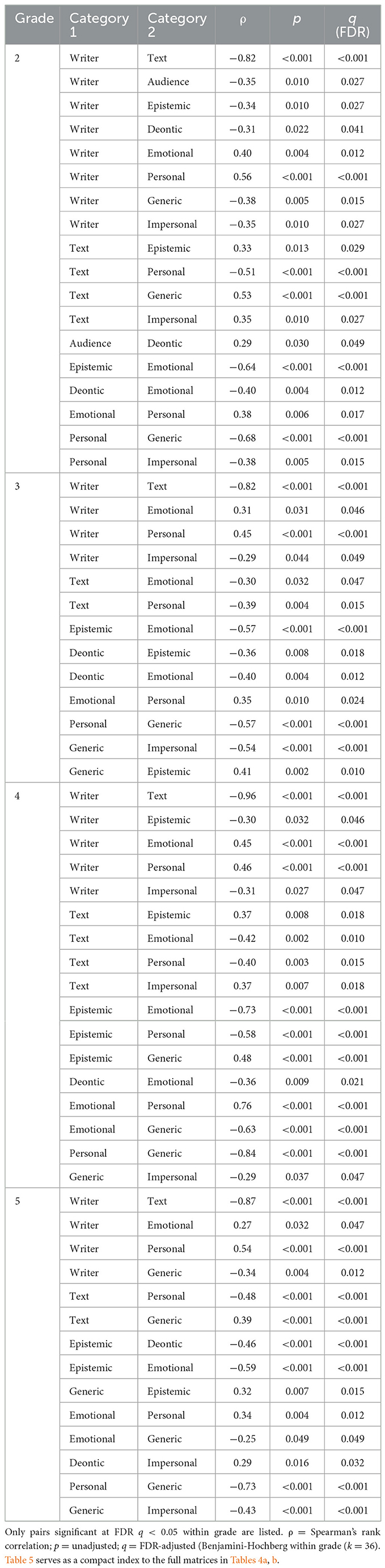 We controlled multiplicity with Benjamini-Hochberg FDR within grade (k = 36) and report ρ together with FDR-adjusted q; cells with q < 0.05 are interpreted as reliable. The complete Tables 4a, b present the full 9 × 9 matrices (in Supplementary Tables; Grade 2 above/Grade 3 below in Table 4a; Grade 4 above/Grade 5 below in Table 4b). Table 5 lists only the FDR-significant associations reported across Grades 2–5. This summary highlights the contrasts between the early writer-personal-emotional cluster and the later text-generic-epistemic cluster, complementing the full correlation matrices in Tables 4a, b (see Supplementary Tables). Within-dimension associations are especially robust for orientation (writer vs. text) and generality (personal vs. generic), while cross-dimension associations include the alignment of emotional stance with personal generality and the tie between text orientation and generic generality. Because Table 5 mixes within- and cross-dimension links, we interpret these classes separately in the narrative.
