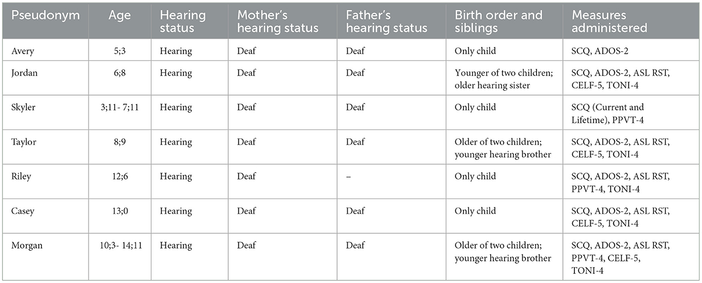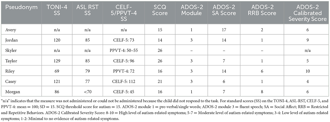 Autism diagnoses were confirmed either through direct assessment, parent-report screeners, or both. The Autism Diagnostic Observation Schedule, Second Edition (ADOS-2; Lord et al., 2012) was administered by a research-reliable clinician fluent in ASL to six of the seven children.
