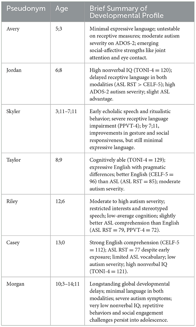 This case series represents a first step toward answering that question by examining a rare but theoretically important population: hearing autistic children born to Deaf parents. These children—commonly referred to as CODAs (Children of Deaf Adults)—grow up in bimodal bilingual environments, acquiring ASL at home and spoken English in the surrounding community. They thus receive early and rich input in both modalities. As such, they offer a unique opportunity to ask whether a signed language is, in fact, more accessible than a spoken language for (some) autistic children when both are equally available from birth. We describe the developmental and language profiles of seven autistic bimodal bilingual children, all of whom were exposed to both ASL and English from birth. Although we offer details on expressive language whenever possible, our analysis focuses particularly on receptive language–at least in terms of formal assessments. The motivation for this choice is that measures of comprehension are more likely to accurately reflect the actual competence of autistic children, since expressive language can be complicated by difficulties with motor planning, recall, retrieval, and execution.