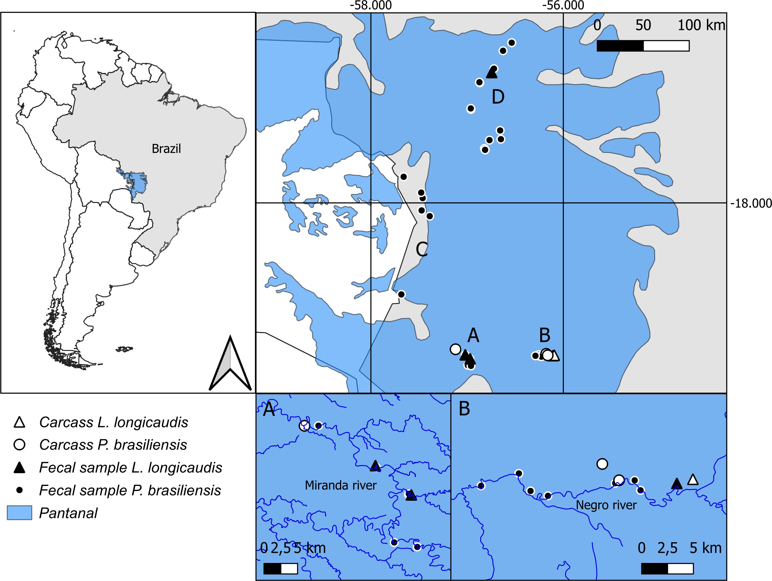 Figure 1. Study site, presenting the location of fecal samples and carcasses of Pteronura brasiliensis and Lontra longicaudis collected from February 2020 to November 2021 in the southern [(A) Aquidauana; (B) Miranda; (C) Corumbá] and northern [(D) Poconé] Brazilian Pantanal.