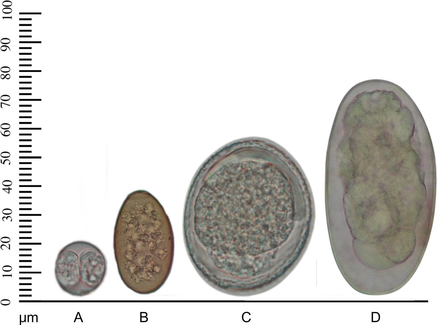 The digenean eggs (n=28) measured 34.5 ± 3.5 µm in length and 21.6 ± 1.1 µm in width. Ascarid eggs (n=8) were 60 ± 13 µm long and 46.2 ± 10 µm wide, and strongylid-type eggs (n=9) were 76.6 ± 20 µm long and 43.3 ± 10 µm wide. The Cystoisospora sp. oocysts (n=10) measured 21.8 ± 3.0 µm in length and 20.1 ± 2.2 µm in width. The oocysts and helminth eggs observed are illustrated in Figure 2.