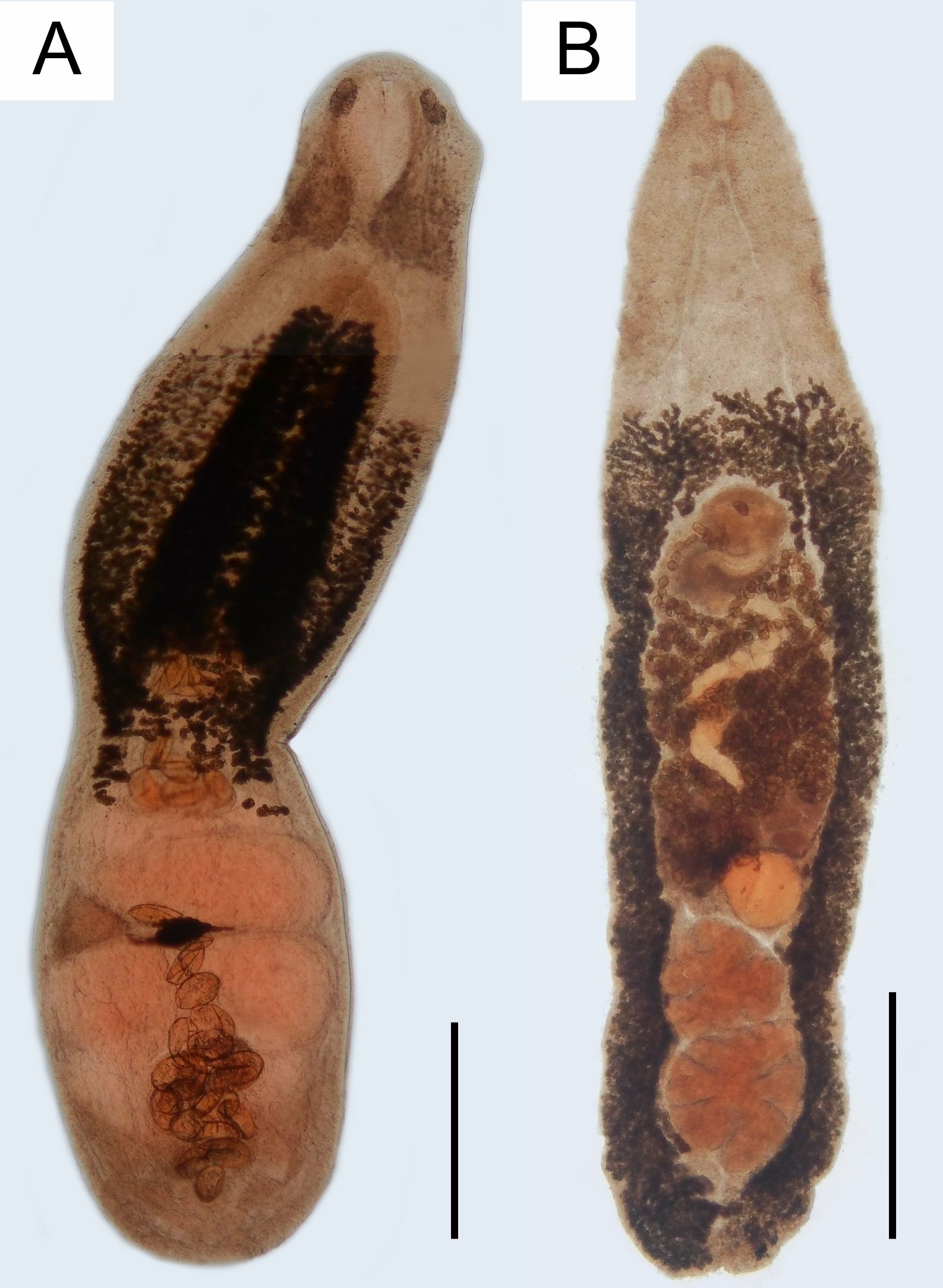 Figure 3. Alaria clathrata and Cryptocotyle thapari from Pteronura brasiliensis, specimen PB1 (Pantanal, February 2020 - September 2022). (A) Alaria clathrata adult worm, whole view, 3000 µm bar. (B) Cryptocotyle thapari adult worm, whole view, 3000 µm bar.
