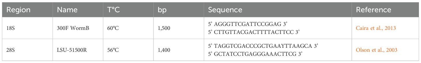 Two adult specimens of each digenean were preserved in absolute ethanol (Merk, Darmstadt, Germany) and stored at −20 °C until processing. The specimens selected for DNA extraction were individually transferred to microtubes and washed with sterile 1× PBS solution (pH 7.4). DNA extraction was performed using the DNeasy Blood & Tissue kit (Qiagen, Hilden, Germany) according to the manufacturer’s protocol. PCR was used to amplify the complete 18S rDNA and the D1–D3 region of 28S rDNA, using the primer sets and melting temperatures listed in Table 1. The preparation of the reaction mixes and the amplification cycles, conducted on a Nexus thermal cycler (Eppendorf, Hamburg, Germany), followed the methodology described by Perin et al. (2023).
