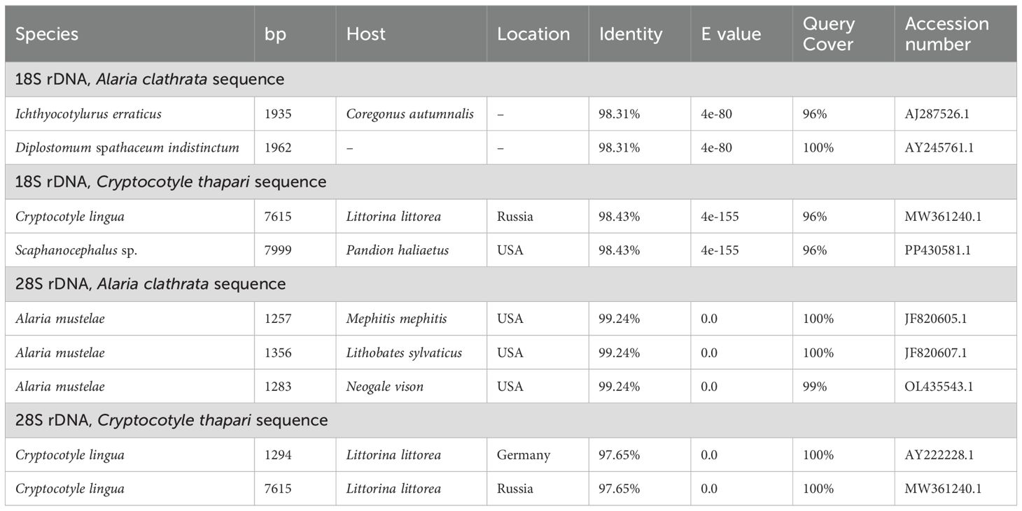 This study represents the first molecular analysis of the digeneans Alaria clathrata and Cryptocotyle thapari, with newly acquired sequences now deposited in GenBank, to support future research. Specifically, we report four novel DNA sequences, two from A. clathrata and two from C. thapari, targeting the 18S rDNA and 28S rDNA regions. The challenges posed by the conservation status of P. brasiliensis and L. longicaudis, as well as difficulties in managing these species in captivity, limit the feasibility of conducting experimental infections. Non-invasive molecular approaches, such as eDNA sampling targeting larval forms and potential intermediate or paratenic hosts (Reza Varzandi et al., 2024), therefore provide a viable alternative. However, these methods remain limited by the scarcity of reference genetic data, a widespread issue in wildlife helminth research (Poulin et al., 2019).