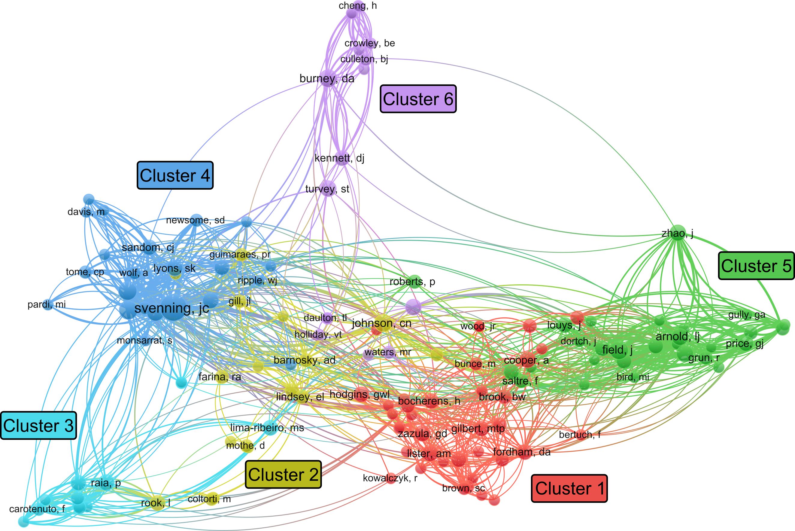For the author citation network analysis, a threshold of three or more publications per author was applied, resulting in 134 individuals which grouped into six clusters (Figure 5). These clusters broadly align with both research discipline and geographic focus. For instance, cluster 4 consists mostly of ecologists, while clusters 1, 3, and 5 are largely researchers working in Eurasia, Australia, and Madagascar, respectively. Ecologists are responsible for a greater number of articles in recent years, indicated by the brighter colors in Figure 6. A further analysis of the gender of the authors, indicates that 80% (n = 107) of the 134 authors are male, pointing to a strong gender bias within the scientific leadership of megafaunal extinction studies.