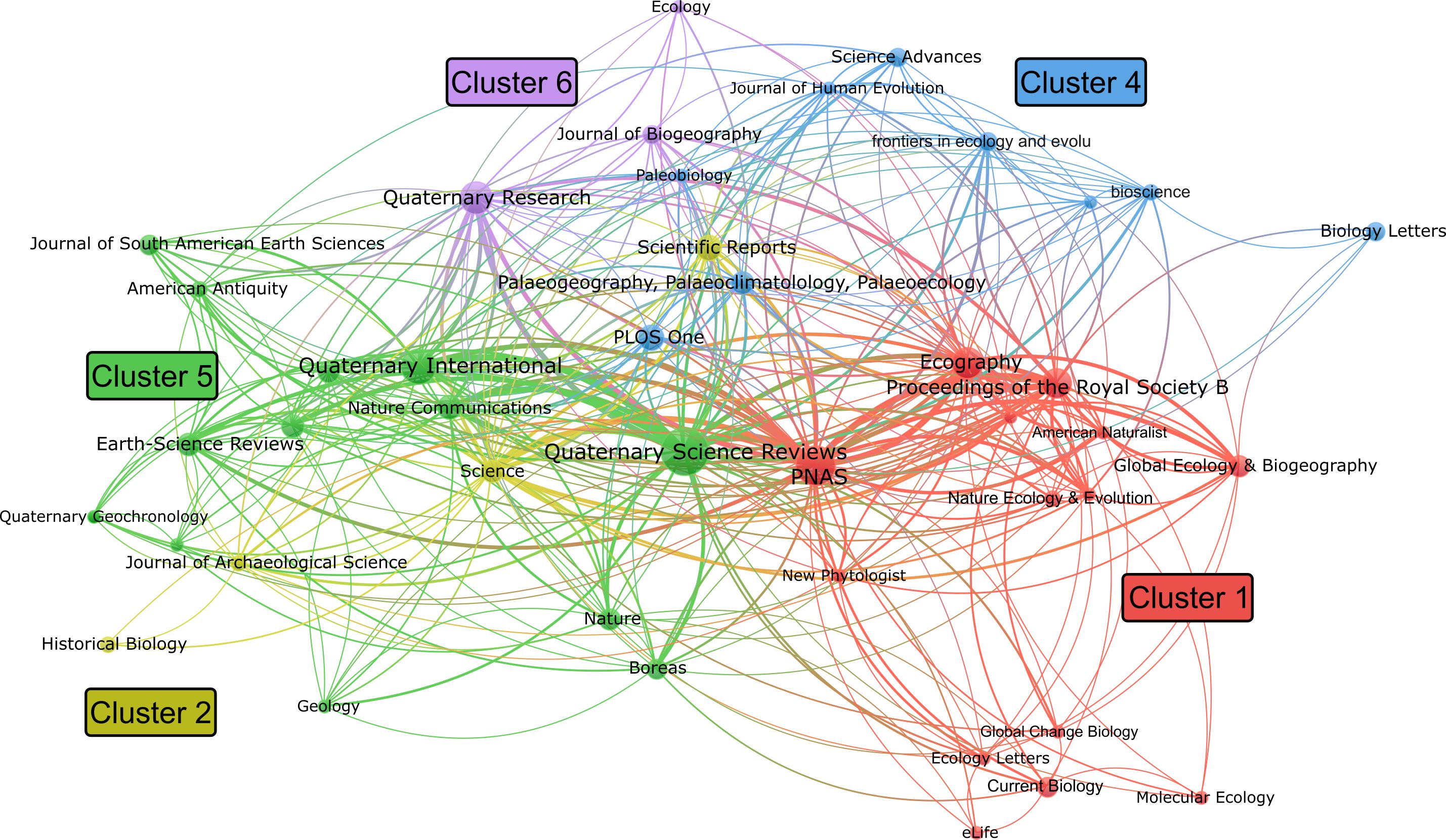 For the journal citation network analysis, a threshold of two or more publications per journal was applied, resulting in 44 journals (Figure 7). The resulting network yielded five distinct clusters, which again largely correspond to disciplinary focus. For example, ecology journals like Ecography, Nature Ecology & Evolution, and Ecology Letters cluster together, as do Quaternary science journals like Quaternary International, Quaternary Geochronology, and Earth-Science Reviews. Two particularly prominent and influential journals in our literature sample are Quaternary Science Reviews and Proceedings of the National Academy of Sciences (PNAS), which contributed 45 and 29 publications, respectively, and exhibit strong citation links with other journals in the network. As shown in Figure 8, ecology journals have become more prominent in recent years.
