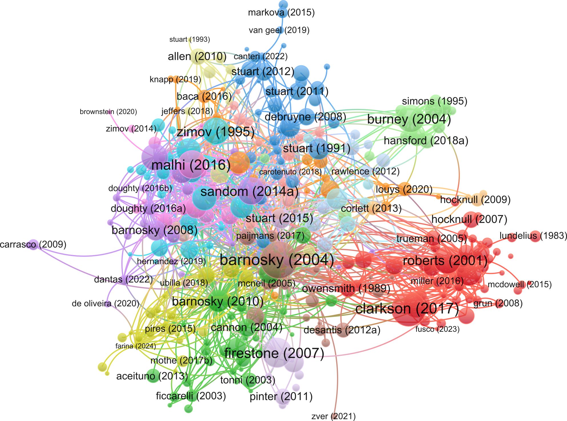 For the publication citation network analysis, 338 articles were analyzed, with 22 excluded due to a lack of connections with other articles. This network yielded 17 distinct clusters, again revealing clear patterns reflecting disciplinary and geographic focus (Figures 9, 2D). Notably, the two review articles by Barnosky et al. (2004) and Koch and Barnosky (2006) stand out as being particularly central and influential in the debate, with a high number of citations and strong links with the broader megafauna extinction literature (Figure 9; Table 2). A comparison with the broader citation network revealed a strong correlation (Supplementary Table S1), indicating that our internal citation metrics reliably reflect the wider influence of papers. The continued publication of megafauna extinction studies in top journals such as Nature, Science, and PNAS highlights the perceived importance and sustained interest in this topic.