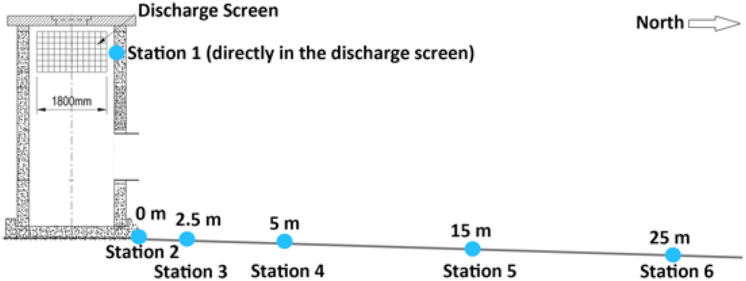 | Station 1 (discharge) | Station 2 (0 m) | Station 3 (2.5 m) | Station 4 (5 m) | Station 5 (15 m) | Station 6 (25 m) | |
