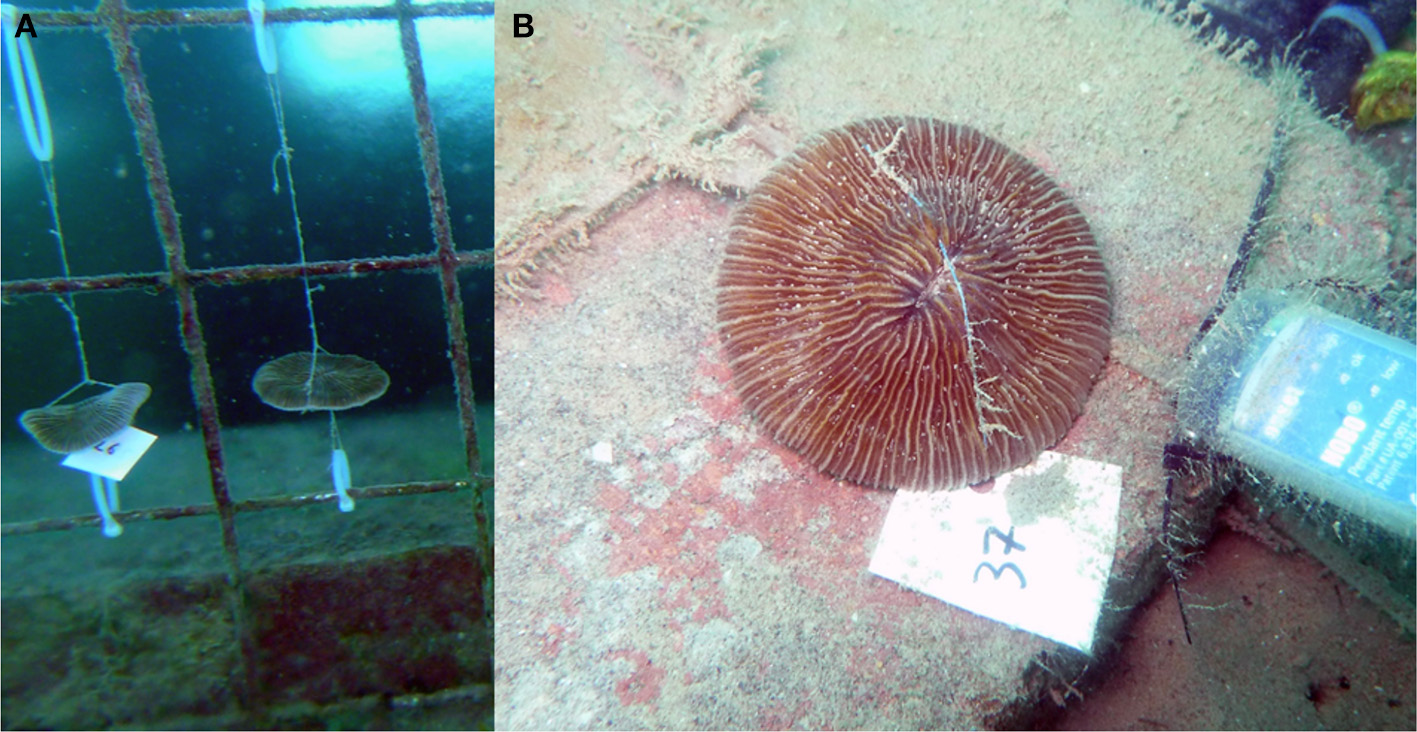 (A) Fungia granulosa attached to the discharge screen. (B) Tagged Fungia granulosa specimen; blue temp logger visible on right hand side (station 6).