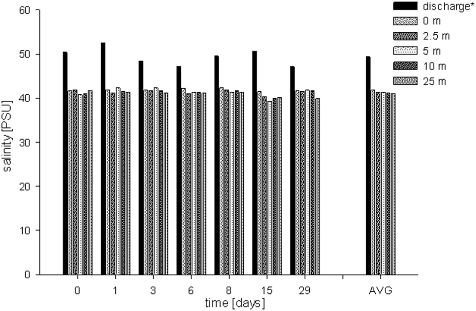 Salinity concentrations measured for each sampling event at each station (6 time points, 6 stations). Average salinities: 49.4 ± 2.0 PSU (discharge screen), 41.8 ± 0.3 PSU (0 m), 41.3 ± 0.6 PSU (2.5 m), 41.3 ± 1.0 PSU (5 m), 41.2 ± 0.6 PSU (15 m) and 41.0 ± 0.7 PSU (25 m), respectively. AVG shows the average salinity at each station.