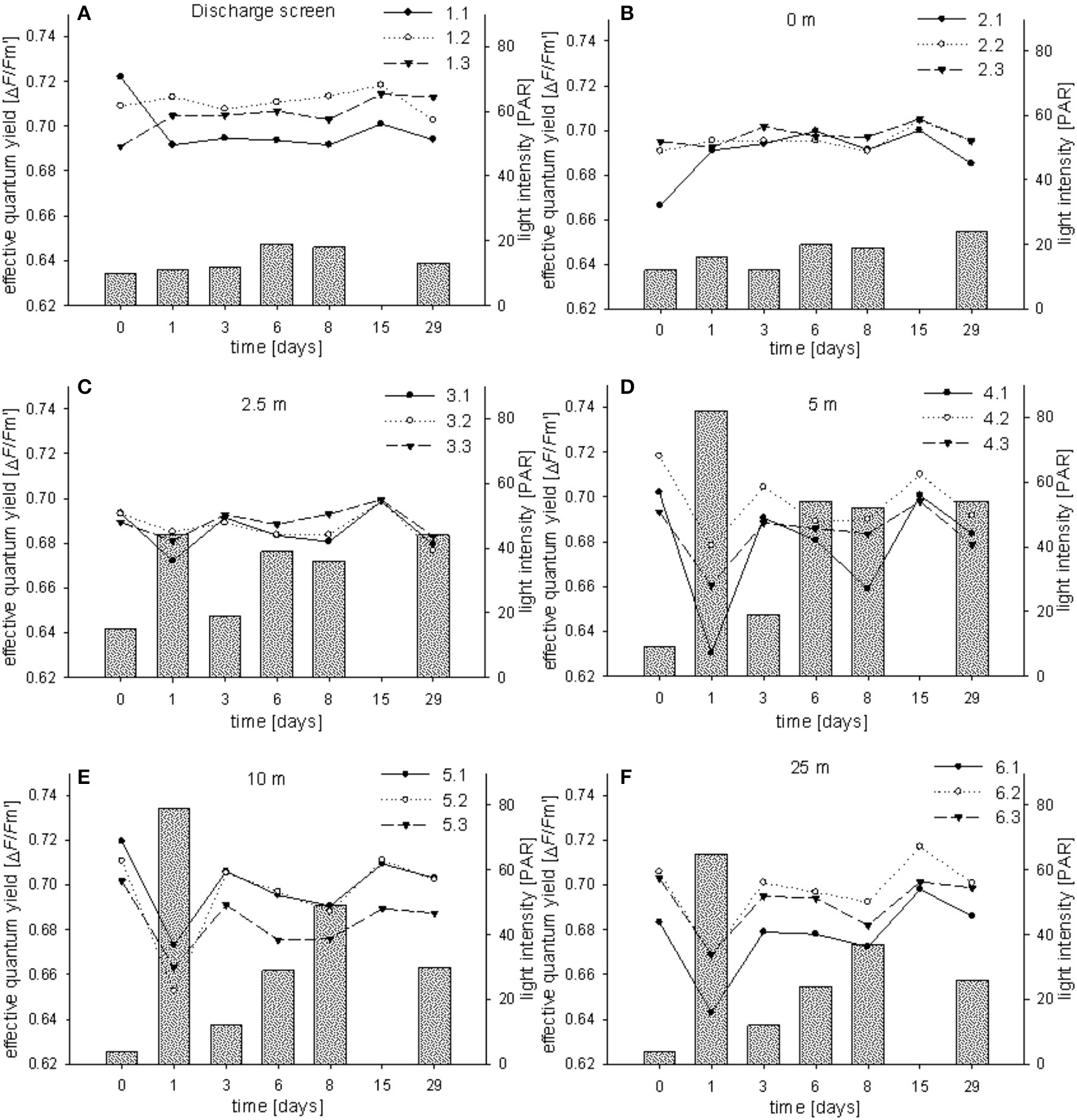 Effective PSII quantum yields (ΔF/Fm′) of individual Fungia granulosa specimens during the 29-day transplantation experiment at each station (A–F). Bars show photosynthetic active radiation (PAR).