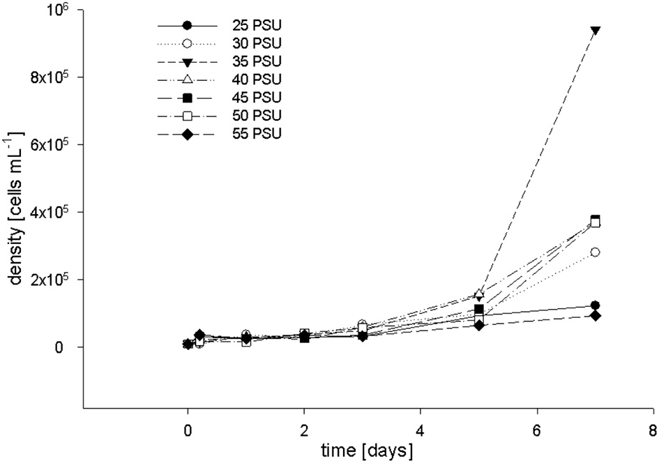 To confirm our in vivo observations, i.e., the absence of measurable detrimental effects of high salinity on the (photo)physiology of F. granulosa, we investigated the response of cultured coral symbionts, i.e., Symbiodinium microadriaticum, to a range of salinity levels. Chlorophyll a levels and growth rate of S. microadriaticum were investigated at salinities between 25 and 55 PSU and samples were taken at 7 time points (0, 1, 2, 3, 5, and 7 d). FACS cell counts and chlorophyll a level measurements showed that Symbiodinium cells reached the exponential growth phase after 4 days of incubation at salinities between 30 and 50 PSU (Figure 5). The quickest cell proliferation was observed at 35 PSU. For concentration levels of 25 and 55 PSU, respectively, the cell growth rates were inhibited. Measuring chlorophyll levels by FACS showed no differences (data not shown).