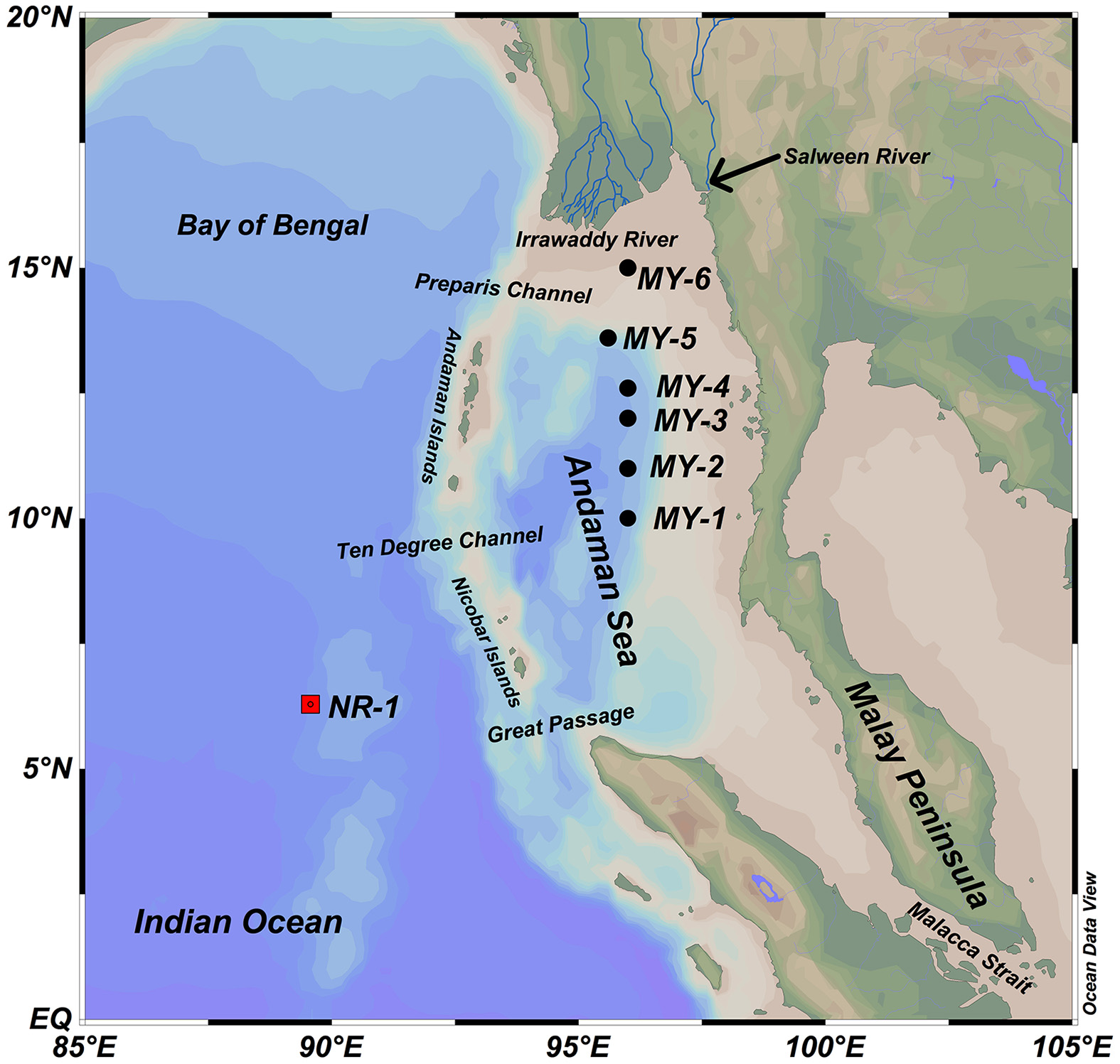 Location of sampling stations in the northeastern Indian Ocean (NR-1, filled square) and the Andaman Sea (MY-1–MY-6, filled circles).