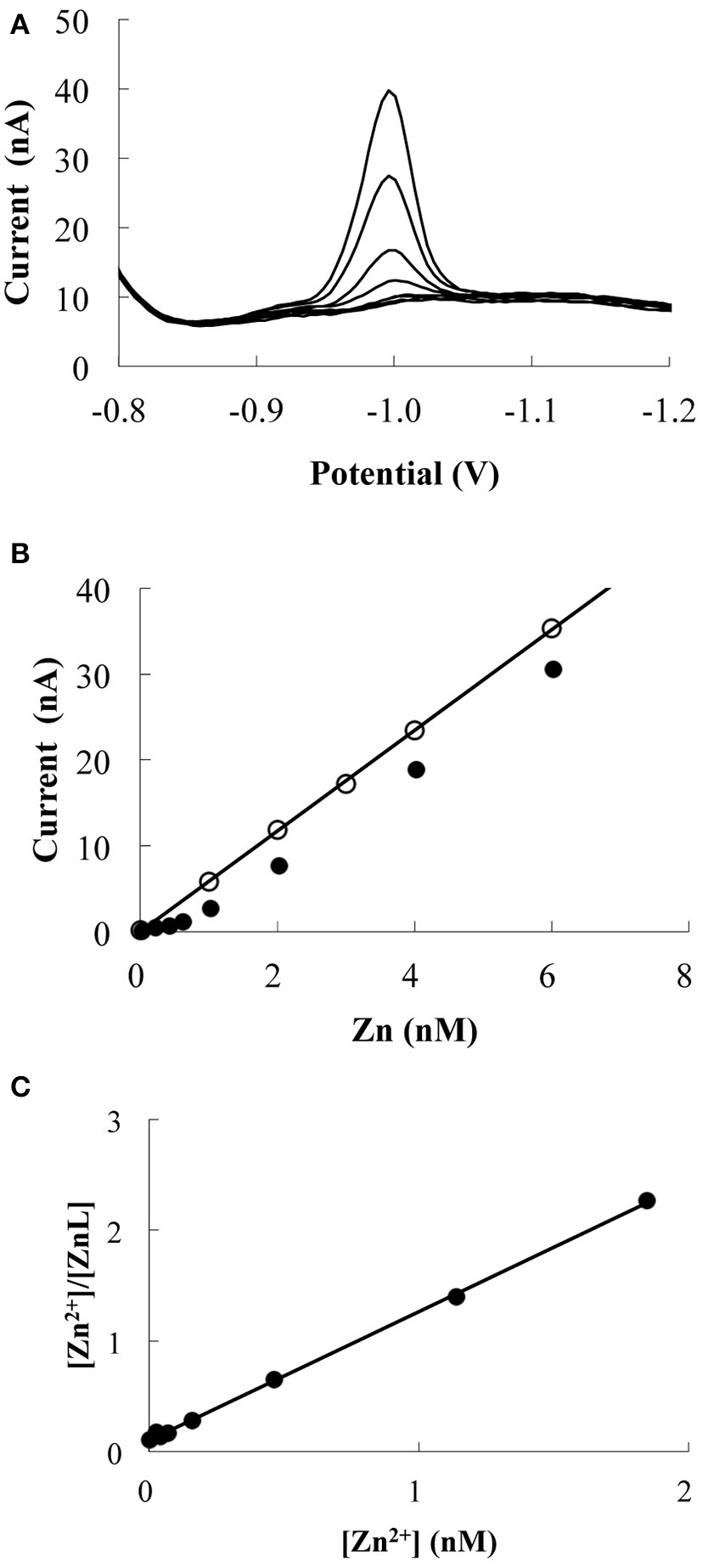 Example of Zn titration data (MY-6, 15 m). (A) Voltammetric scans for Zn additions. (B) The response of Zn peak current with increasing Zn additions. The line and blank circles indicate the response of UV-irradiated sample. (C) Linear relationship obtained by transforming the titration data. The calculated CL and log K′ZnL, Zn2+ were 0.9 nM and 10.1, respectively.