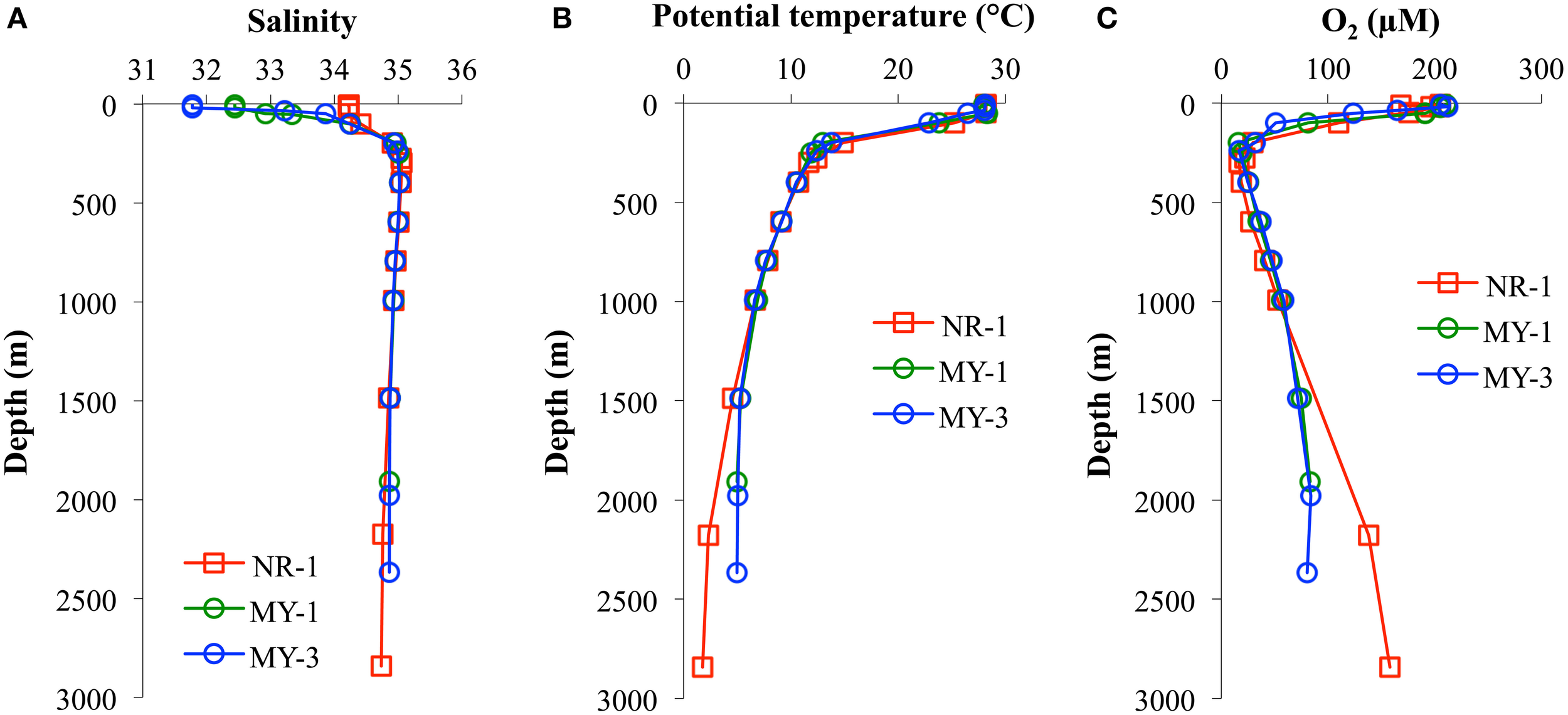 Table 1 shows the data obtained in this study. The surface salinities at < 50 m in the Andaman Sea (MY-1–MY-6), 28.624–33.864, were relatively lower than those of in the northeastern Indian Ocean (NR-1, 34.226–34.228). Additionally, the surface salinities in the Andaman Sea were gradually increased from north to south (Table 1). Figure 3 shows the vertical profiles of salinity, potential temperature, and dissolved O2 in both the northeastern Indian Ocean (NR-1) and the Andaman Sea (MY-1 and MY-3). The deep water of the northeastern Indian Ocean is most simply characterized as a tongue of circumpolar water extending north from the south (Wyrtki, 1971). In the Southern Ocean, the original circumpolar deep water has relatively high salinity and O2 due to the presence of North Atlantic Deep Water. Although dissolved O2 is consumed by respiration during the northward transport of the deep water, the salinity in circumpolar deep water of the northeastern Indian Ocean (NR-1) and the Andaman Sea (MY-1 and MY-3), remains high as indicated by the maximum salinity of >35.000 at 275–596 m (Figure 3A).