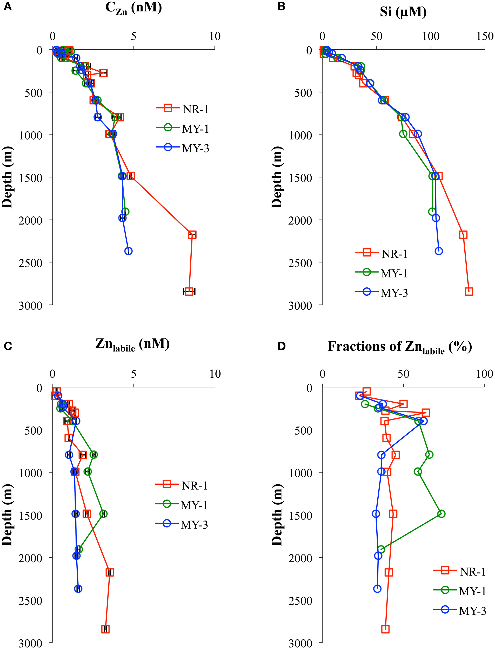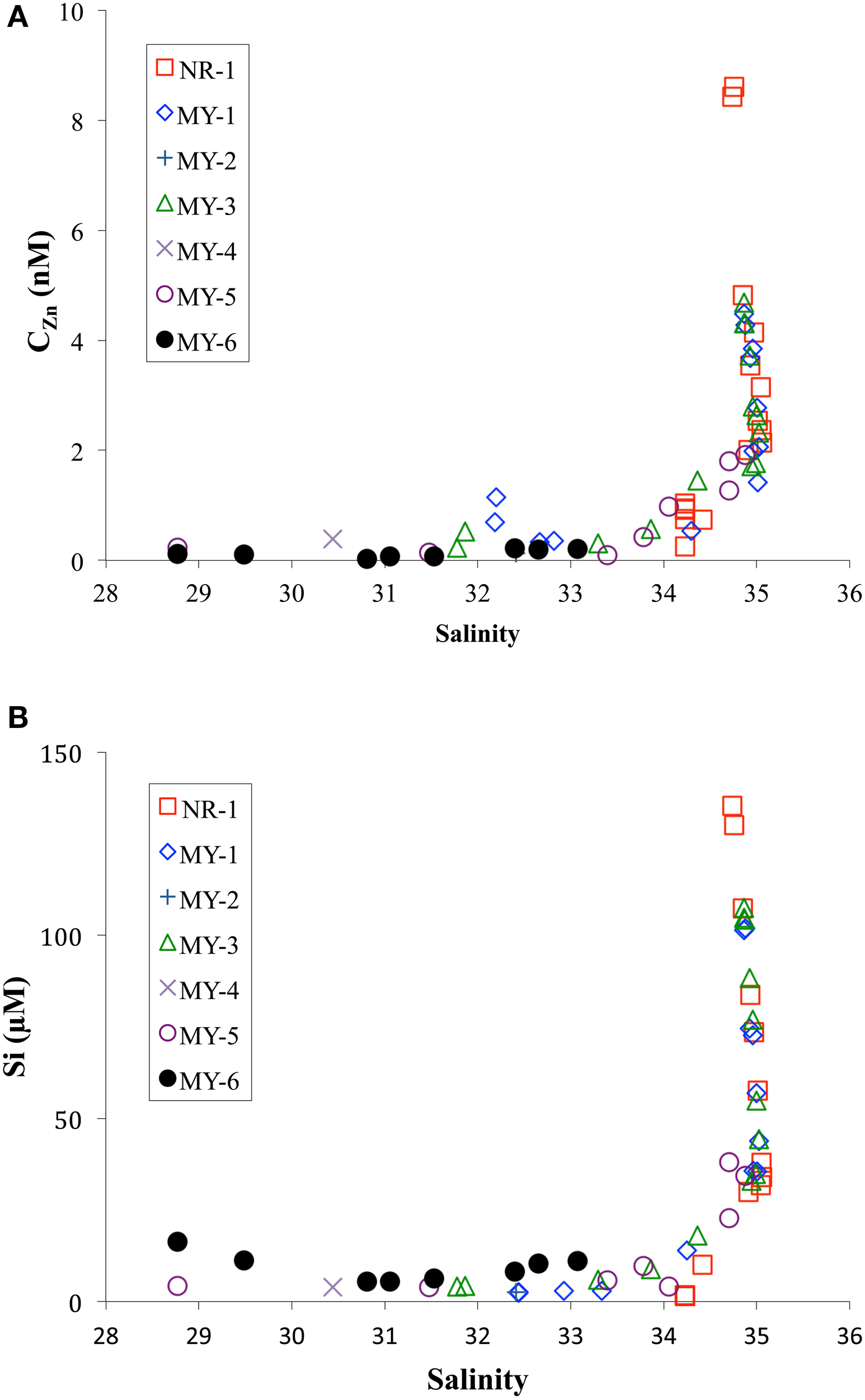 Zn is used in numerous enzyme systems involved with a variety of metabolic processes (Vallee and Auld, 1990). In the ocean, total dissolved Zn concentration (CZn) has a nutrient-like vertical profile with a particularly strong correlation with silicate (Bruland, 1980). However, a previous study showed that biogenic opal has low Zn content, which suggests that Zn is not directly involved with Si uptake and that the amount of Zn incorporated into opal represents only 1–3% of the total amount taken up by diatoms (Ellwood and Hunter, 2000). Thamatrakoln and Hildebrand (2008) also suggested that Zn is not involved in silicon uptake or in silicon transporter proteins. A recent study has shown that scavenging of dissolved Zn onto sinking particles could be a reason of deeper Zn regeneration, generating depth profiles similar to that of silicate (John and Conway, 2014). Low Zn concentrations could limit CO2 uptake and, ultimately, the growth rate in some cells through reduced production of the enzyme carbonic anhydrase (CA; Price and Morel, 1990; Morel et al., 1994; Lane and Morel, 2000). Low rates of phosphate uptake from dissolved organic P in oligotrophic waters have been linked to the limitation of available Zn in seawater via its central role in the enzyme alkaline phosphatase (Shaked et al., 2006). At high concentrations, Zn could be toxic to phytoplankton and bacteria (Sunda and Huntsman, 1996, 1998; Chen et al., 2008). Moreover, low Zn concentrations in surface seawater could limit growth of some kinds of phytoplankton (Brand et al., 1983; Sunda and Huntsman, 1998, 2000), although Zn limitation has not been observed in field studies (Coale et al., 2003; Crawford et al., 2003; Lohan et al., 2005; Jakuba et al., 2012).