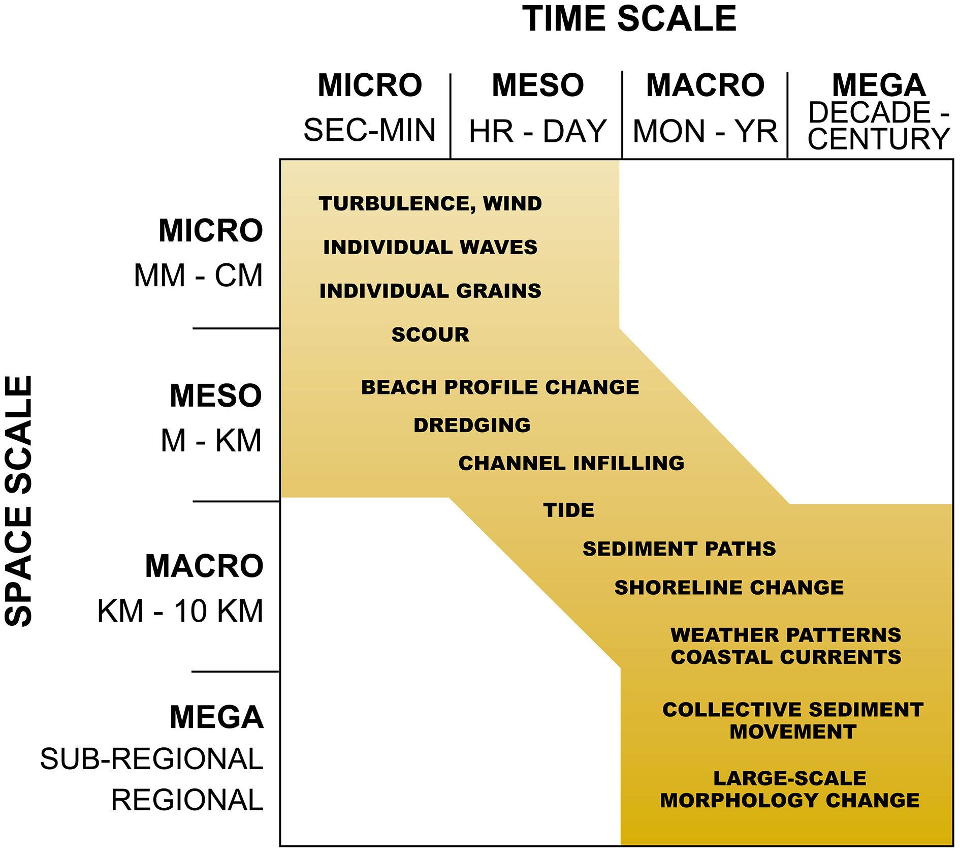 Compatible temporal and spatial scales for sediment transport and beach morphology. White spaces indicate combined space-time scales considered to be incompatible, or unfeasible (redrawn from Larson and Kraus, 1995, with permission from Elsevier). There are various similar diagrams of this type in the literature.