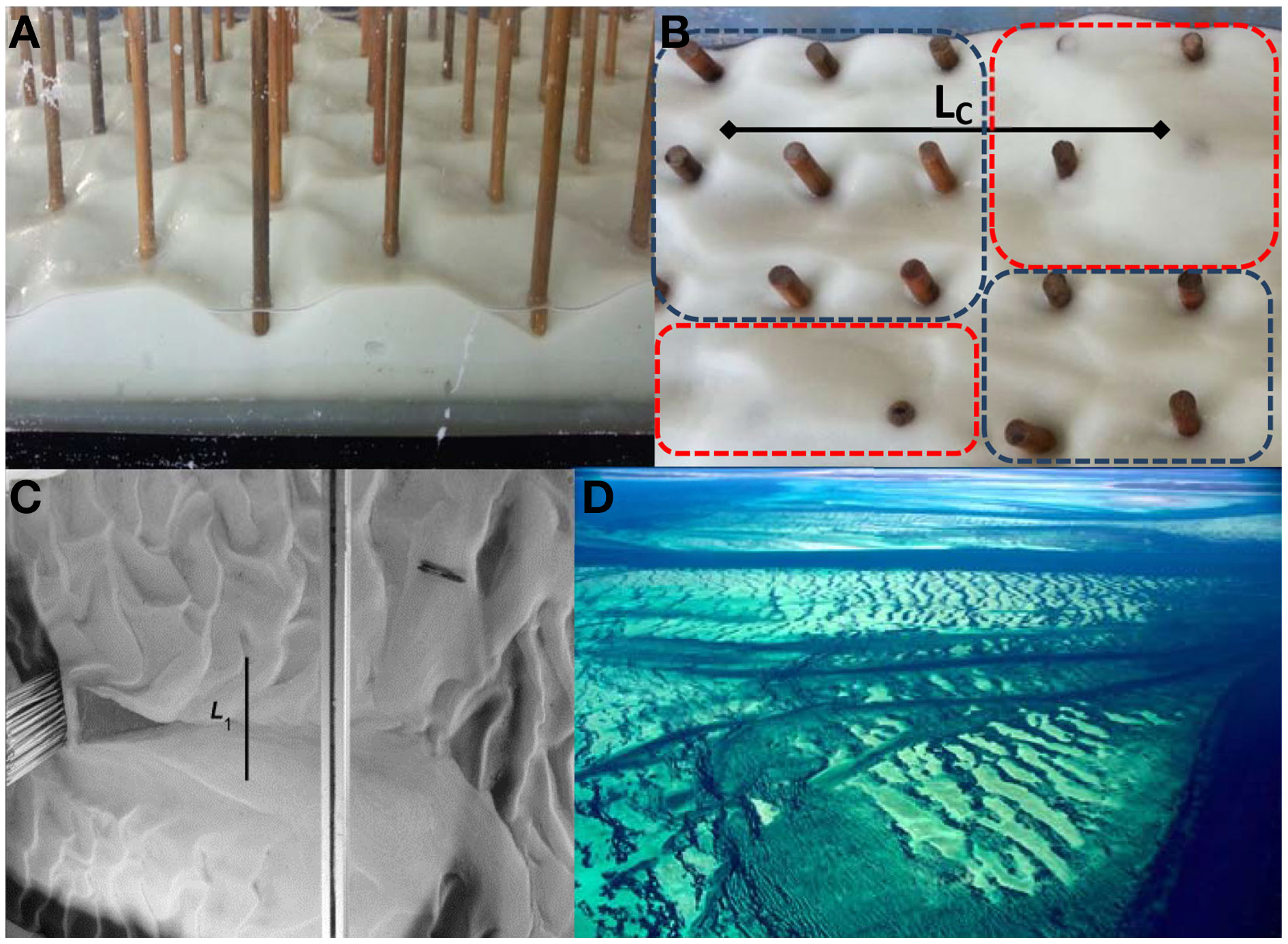 Demonstrations of scales of sediment transport in seagrass meadows. (A) Stem-scale scour in the laboratory (Ng, 2013); (B) Canopy-scale heterogeneity of sediment transport in a uniform array in the laboratory (adapted from Ng, 2013). Alternating zones of strong sediment deposition (red zones, often burying canopy elements) and sediment erosion (blue zones), separated by a distance of the order of LC, are evident; (C) Panoramic view of patch-scale sediment transport in the laboratory. The patch on the left-hand side (flow is from left to right) creates strong scour within the patch, deposition behind the patch, and patch-driven bedforms (taken from Follett and Nepf, 2012); (D) Fauré Sill (500 km2) in Shark Bay, Western Australia, which has formed through thousands of years of sediment deposition within a seagrass meadow (Davies, 1970; image taken by Western Australian Department of Parks and Wildlife).
