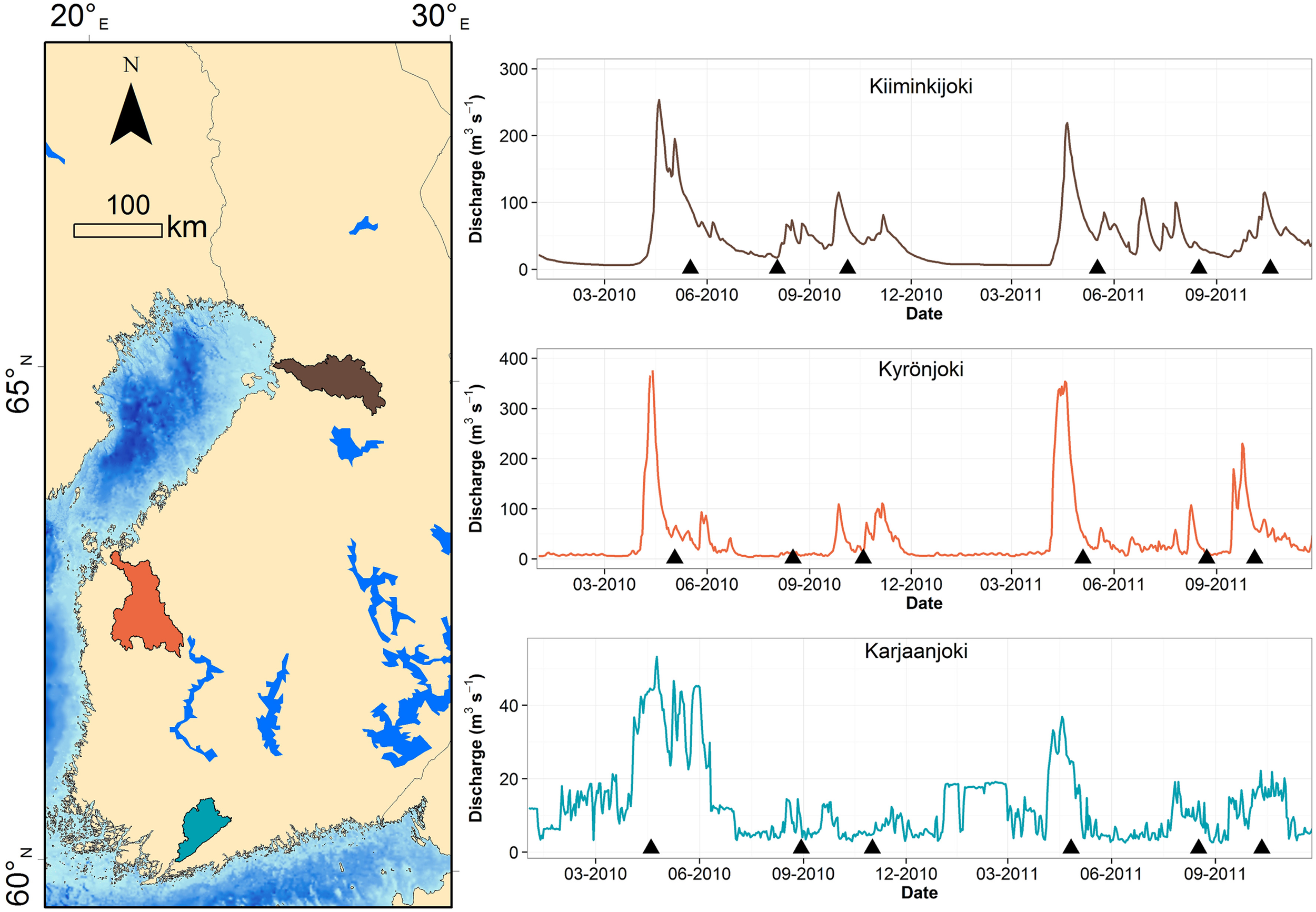 Our field data comes from transect samplings conducted in three Finnish rivers draining to the Baltic Sea: Karjaanjoki, Kyrönjoki, and Kiiminkijoki, sampled in the spring, summer, and autumn of 2010 and 2011 (Figure 1). Each transect consisted of five to six horizontal sampling points from surface layer and below the river water lens, typically at 5 or 10 m depth. There were 18 transect datasets with n = 187 observations in total.