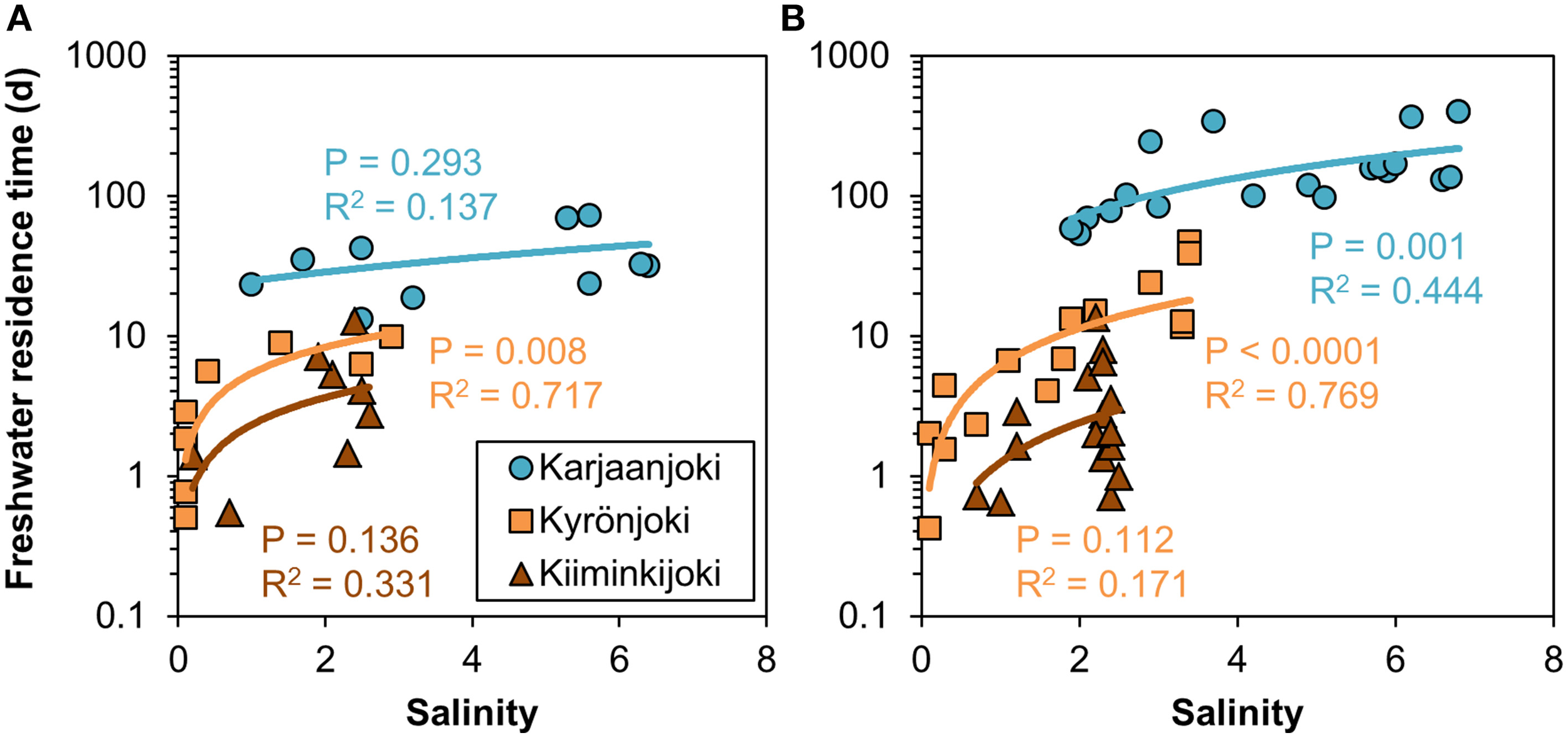 The calculated freshwater residence time in the studied estuaries varied greatly from 0 days at the river mouth to 395 days in the outer Karjaanjoki estuary. In Kyrönjoki and Kiiminkijoki estuaries the longest residence times were 47 and 13 days, respectively. The relationships between freshwater residence time and salinity were highly variable, as for example freshwater residence time varied from a few days to a few months at salinity around 2 (Figure 2). Freshwater residence time increased sharply at low salinity and gradually flattened toward the seaward end-member. The relationships varied between estuaries and flow regimes: The long and relatively deep Karjaanjoki estuary, which also receives the lowest river discharges, had the highest freshwater residence times in general and the increase of residence time with increasing salinity was the highest in Karjaanjoki estuary. Kyrönjoki and Kiiminkijoki estuaries had higher freshwater discharges, and lower surface volumes, resulting in considerably lower residence times. During seasons with high river flow, the freshwater residence time was generally lower along the salinity gradient as compared to the periods of low river discharge (Figure 2).
