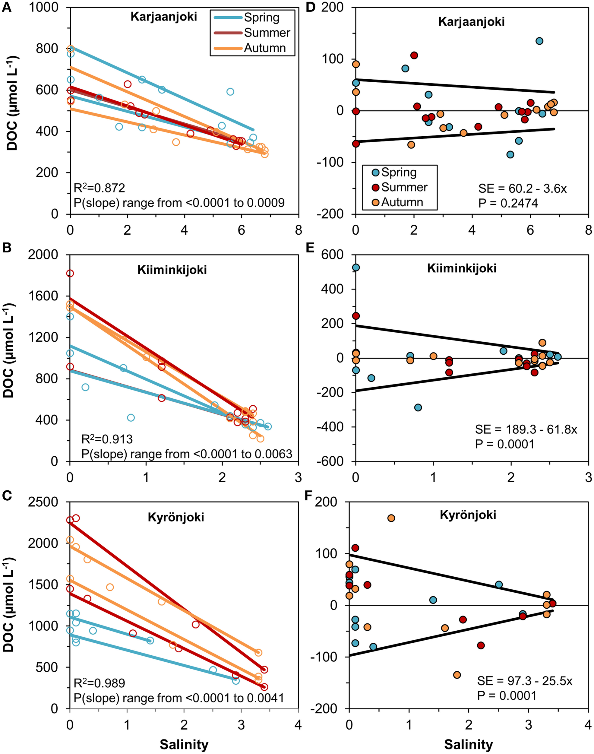 (A–C) Linear regressions between DOC concentration and salinity for each sampling transect, estuary, and season. Observations are shown with open symbols. All slopes are significant (P < 0.05) and the R2 is for all regressions within the estuary. (D–F) Residuals from the regression models and the estimated models for the residual standard error for the three estuaries.