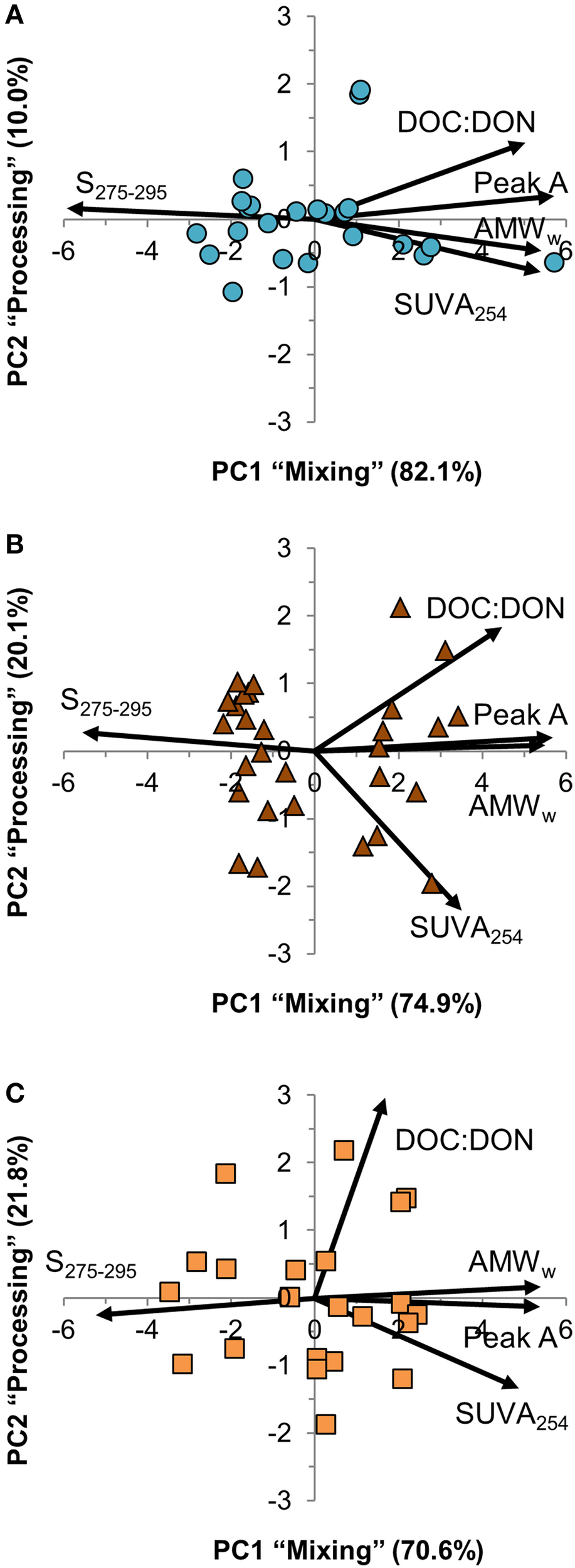 Principal component analysis (PCA) correlation biplot of the two first principal components (PC1 and PC2). Samples are shown as symbols and the contribution of the DOM quality variables to the principal components as vectors. The proportion of variation explained by both principal components is included with the axes titles. (A) Karjaanjoki, (B) Kiiminkijoki, and (C) Kyrönjoki estuary.