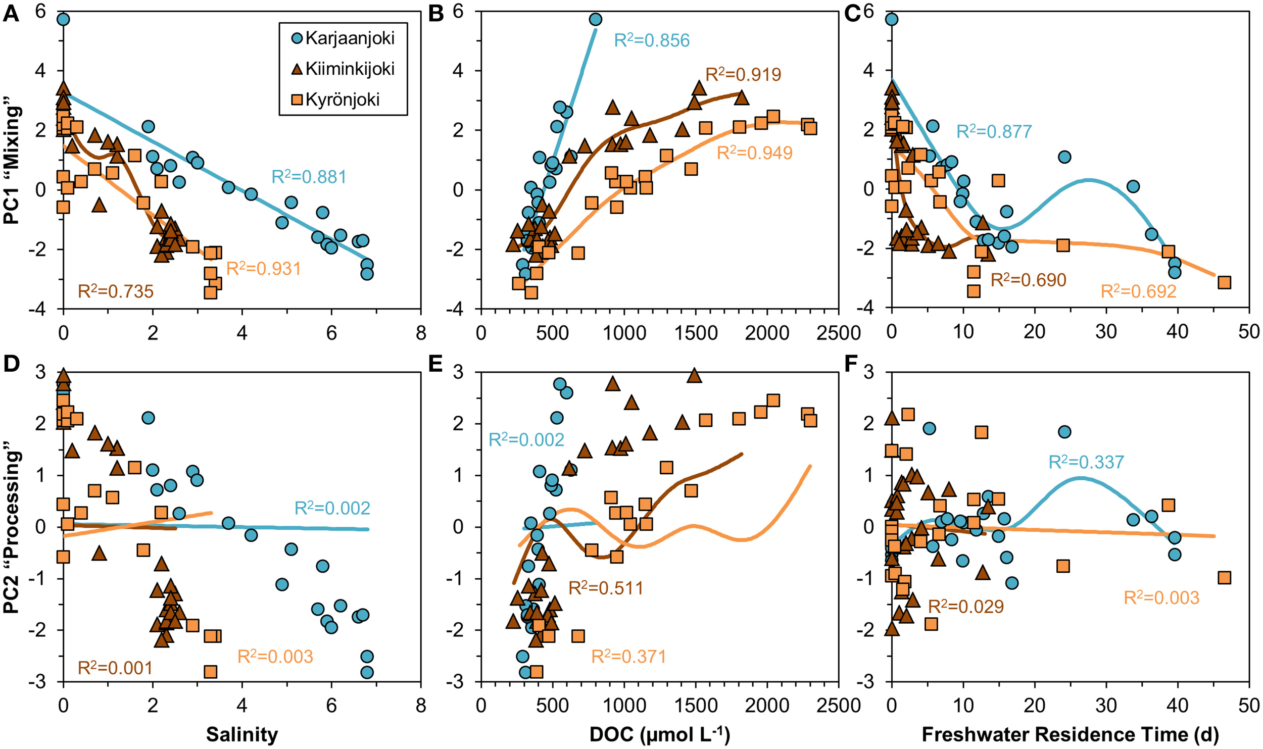 We examined the information contained in PC1 and PC2 in relation to salinity, DOC concentration and freshwater residence time (Figure 6). PC1 had a strong, mostly linear relationship with both salinity and DOC concentration (Figures 6A,B), whereas the relationship between PC1 and freshwater residence time was non-linear (Figure 6C). The strongest relationships for PC1 were salinity in Karjaanjoki and DOC in Kiiminkijoki and Kyrönjoki. PC2 was related neither to salinity nor freshwater residence time (Figures 6D,F), whereas a weak coupling to DOC was observed in Kiiminkijoki (Figure 6E). Nevertheless, no general pattern was found using salinity, DOC and freshwater residence time as explanatory variables for the variations in PC2. We have labeled PC1 as “Mixing” and PC2 as “Processing” for clarity, and the justification of this is presented in Section Discussion.