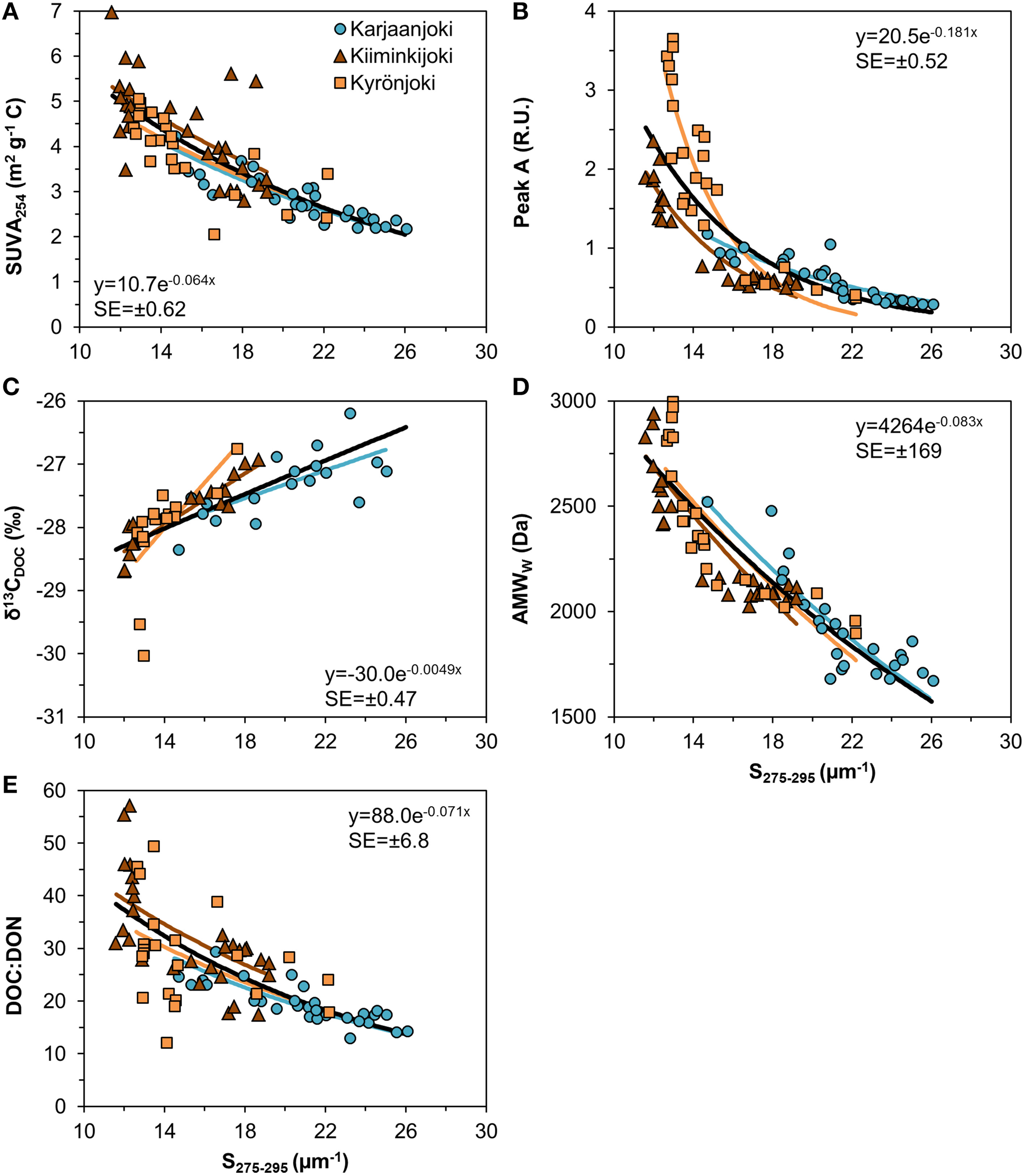 Relationship between UV slope (S275−295) and other DOM quality variables used in this study. (A) SUVA254; (B) Fluorescence peak A; (C); (D) AMWW; (E) DOC:DON ratio. Exponential models were fitted to data for each estuary after testing for common intercepts and exponential slopes. A common model (black line) was fitted to all data with the formula and the residual standard error (SE) inserted in the plots.