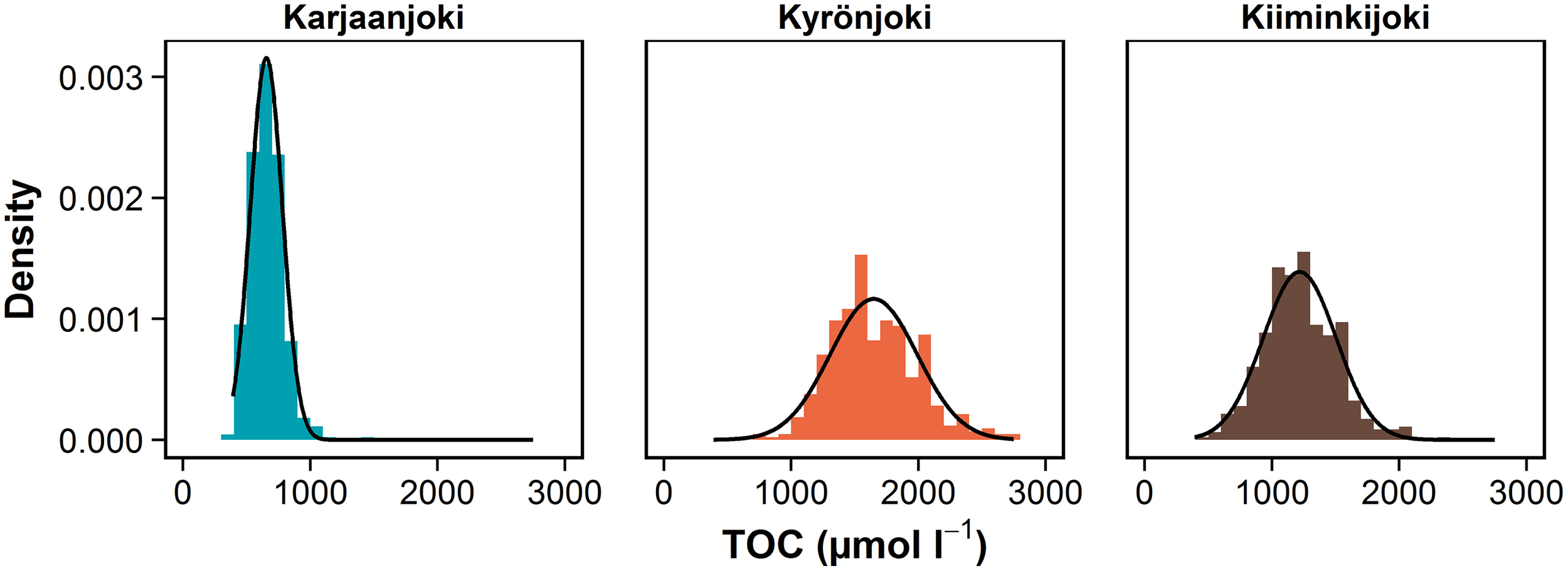 Density of observed TOC concentrations in river end-members of study estuaries between 1975 and 2014. Mean values, standard deviation and range: Karjaanjoki (n = 442) 655 (126, 392–1417), Kyrönjoki (n = 425) 1648(342, 758–2750), and Kiiminkijoki (n = 463) 1217(287, 467–2333) μmol L−1. More than 90% of TOC is in dissolved form (DOC) in these systems (Mattsson et al., 2005). Data source: Räike et al. (2012). Normal distribution curve is fitted over each density histogram.
