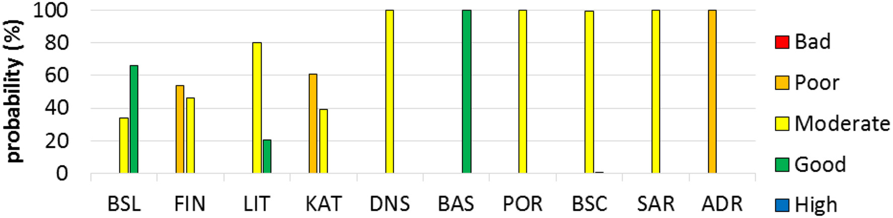 Probabilities for the five environmental status classes for each of the 10 case study assessments. Good environmental status is assumed attained if the cumulative probability of “Good” and “High” is higher than the cumulative probability of “Moderate,” “Poor,” and “Bad.” If opposite, the Good environmental status is not attained. For case study codes see Table 1.