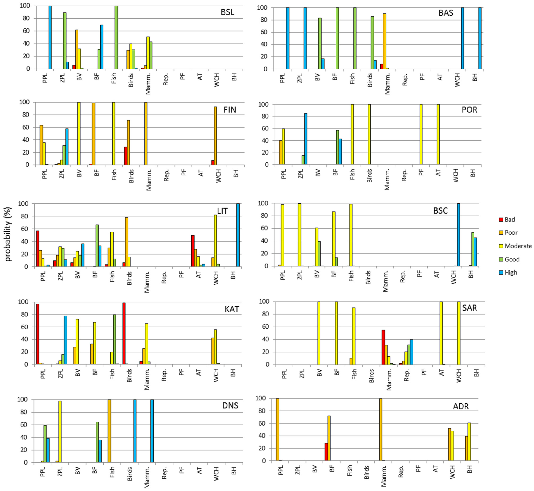 Probabilities for the five environmental status classes separated by ecosystem component for each of the 10 case studies (for codes see Table 1). Ecosystem components considered are: Phytoplankton (PPL), zooplankton (ZPL), benthic vegetation (BV) benthic fauna (BF), fish, birds, mammals (Mamm.), reptiles (Rep.), pelagic fauna (PF), all taxa (AT), water column habitat (WCH), benthic habitat (BH).